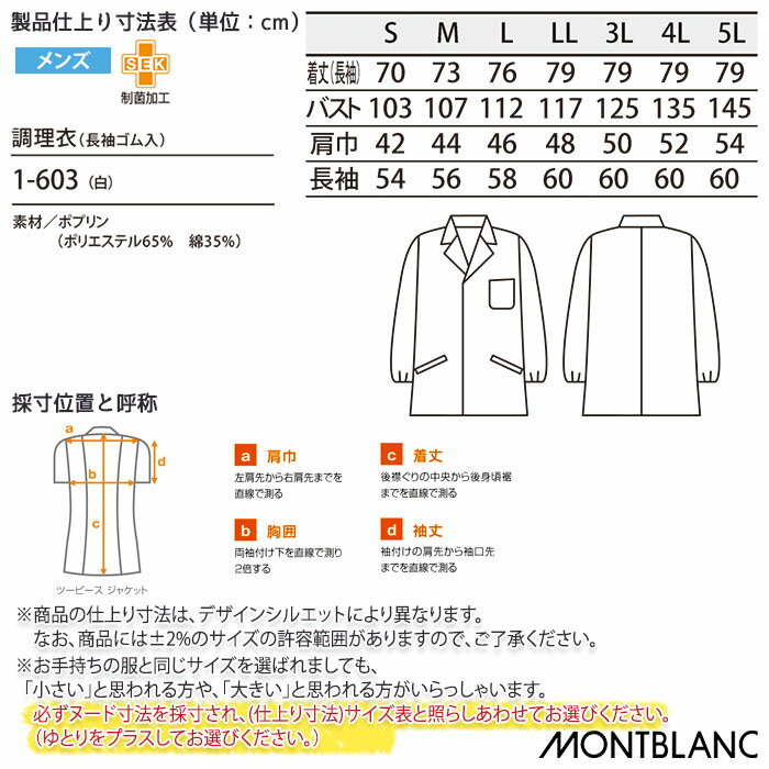 商品詳細 調理衣は、清潔感のあるさわやかな白と、すっきりとシンプルなデザインが基本。幅広い調理場に適した定番シルエット。綿ならではの肌ざわりのよさに加え、ポリエステルが持つ耐久性を備えています。さらに、袖口はゴム入りなので、手元の動きを妨げにくく、作業効率もアップします。 ■品名・品番 調理衣(長袖ゴム入)(男性用/メンズ)・1-603 ■カラー 1-603.白 ■サイズ S M L LL 3L 4L 5L サイズ表(仕上り寸法) 採寸方法 ■素材 ポプリン(ポリエステル65% 綿35%) ■仕様・特長 男性用 制菌加工 長袖 袖口ゴム入り 左胸ポケット 両腰ポケット 前立て比翼仕様 ■着用シーズン オールシーズン ■同シリーズ 調理衣(メンズ・長袖ゴム入)1-603 調理衣(メンズ・半袖)1-602 調理衣(レディース・長袖ゴム入)1-001 調理衣(レディース・半袖)1-002 ■メーカー・ブランド 住商モンブラン・MONTBLANC(モンブラン) お届け情報 メーカーお取り寄せの商品です。 ※メーカー在庫依存のため、在庫切れの際はご容赦ください。ご注文後のメーカー在庫確認となります。 ■発送までの目安 メーカーに在庫が有る場合は、7日前後 ■配送方法 宅配便 【サービス 調理白衣 S M L LL 3L 4L 5L 白 ホワイト メンズ 男性用 オールシーズン 長袖 制菌加工 飲食店 厨房 食堂 和食 老舗】