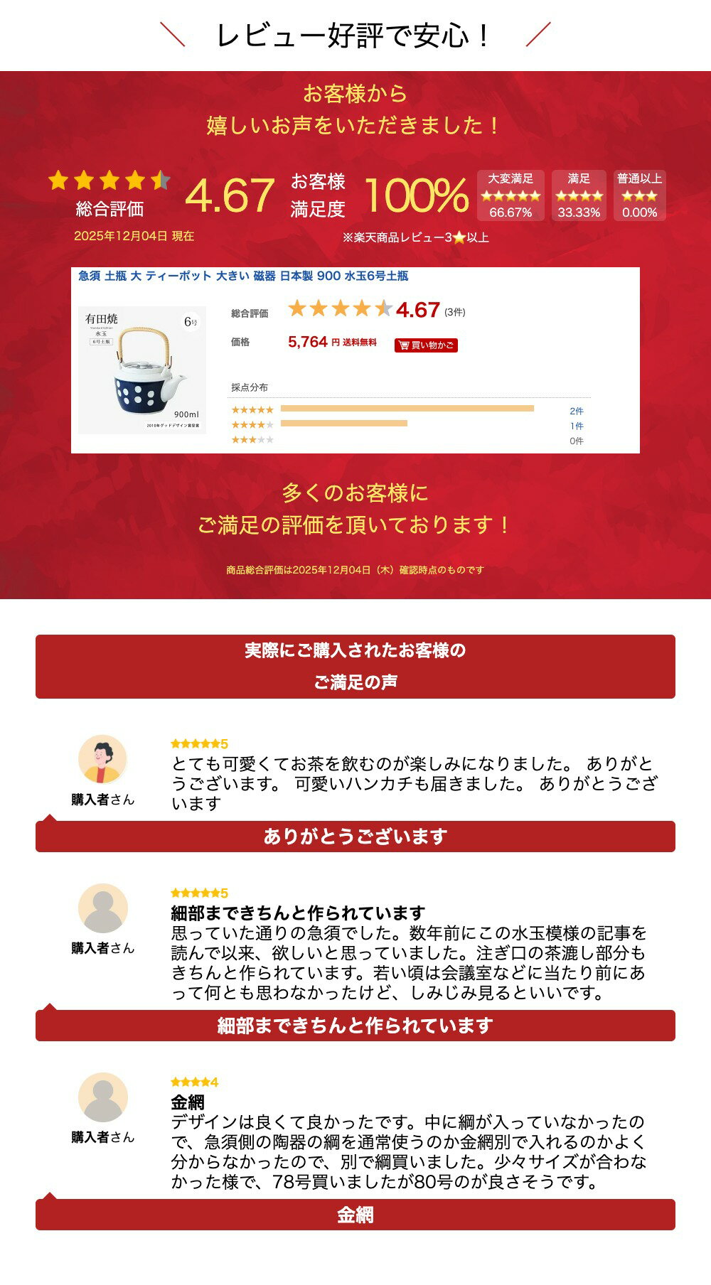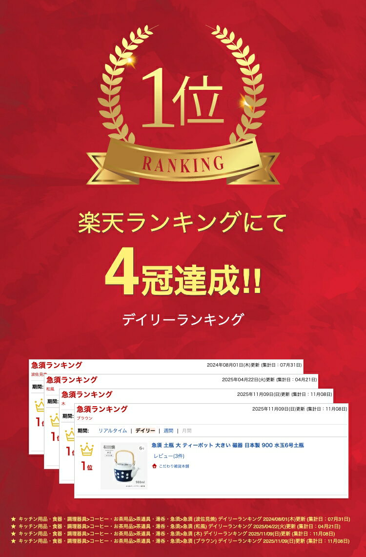 材質: 磁器 サイズ: 直径13.5×11cm 容量(約): 900ml 重量(約): 520g 生産国: 日本(Made in Japan) ご注意: 釉薬をかけたり、色を塗ったりなどの作業工程上、器によりましては若干の色ムラ、模様の違い、等がでる場合がございます。 関連商品 水玉10号土瓶 水玉 中仙茶 5客組 水玉 玉仙茶 5客組 水玉 丸4号土瓶 水玉 中急須 水玉 反仙茶 5客組 水玉8号土瓶 水玉6号土瓶 商品名:水玉6号土瓶 【rakutentera】関連商品急須 土瓶 辻が花 MS4号土瓶 73470シンプル 茶こし付き お手...急須 土瓶 陶器 和食器 お茶 水玉 中急須...急須 土瓶 ドット 丸 藍色 紺 磁器 和食器 お茶 水玉 丸4号土瓶...急須 土瓶 大 ティーポット 大きい 磁器 日本製 1800 水玉10...5,220円5,764円5,873円8,484円急須 土瓶 鎌倉十草MS8号土瓶 大 ティーポット 大きい 磁器 有田...急須 土瓶 大 ティーポット 大きい 磁器 日本製 1400 水玉8号...急須 土瓶 鎌倉十草MS6号土瓶 大 ティーポット 大きい 磁器 有田...急須 土瓶 二色十草・緑釉水玉 SS5号土瓶大 シンプル グリーン 緑...10,659円7,396円9,136円7,614円大きい土瓶シリーズです。 法事などたくさんの来客時に重宝します。 一つは持っておきたいサイズです。 ギフト対応 【ご注意】販売しております商品はメーカー取寄品も含まれるため、お届け日の遅れ、完売によりお届けできない場合もございます。後ほど当店より送信されるメールをご確認ください。 商品名:水玉6号土瓶商品コード:199231860 旬なキーワード:おしゃれ おすすめ ギフト お祝い プレゼント 贈り物 かわいい 引き出物 還暦祝い 新築祝い 誕生日 おうち時間 内祝い 高級食器セット 和食器 和モダン おしゃれ かわいい お祝い 贈り物 ファミリー用 来客用 ゲスト 結婚祝い プレゼント ギフト 友達 男性 メンズ クリスマス 誕生日プレゼント 和柄 和風 和 和食 自宅 おうち時間 お家時間 皿 お皿 プレート 小皿 取り皿 モダン カジュアル キッチン オシャレ 母の日 父の日 新築 新築祝い 新居 新居祝い 出産内祝い 家庭用 自宅用 女性 レディース 大人可愛い ホームパーティー おもてなし ランチ ベーシック 定番 普段使い おすすめ 新生活 トータルコーディネート インスタ映え オススメ 家族 ファミリー 大人 お年寄り 高齢者 シニア 来客用 ゲスト お洒落 可愛い 夫婦 カップル 結婚 ブライダル 内祝い