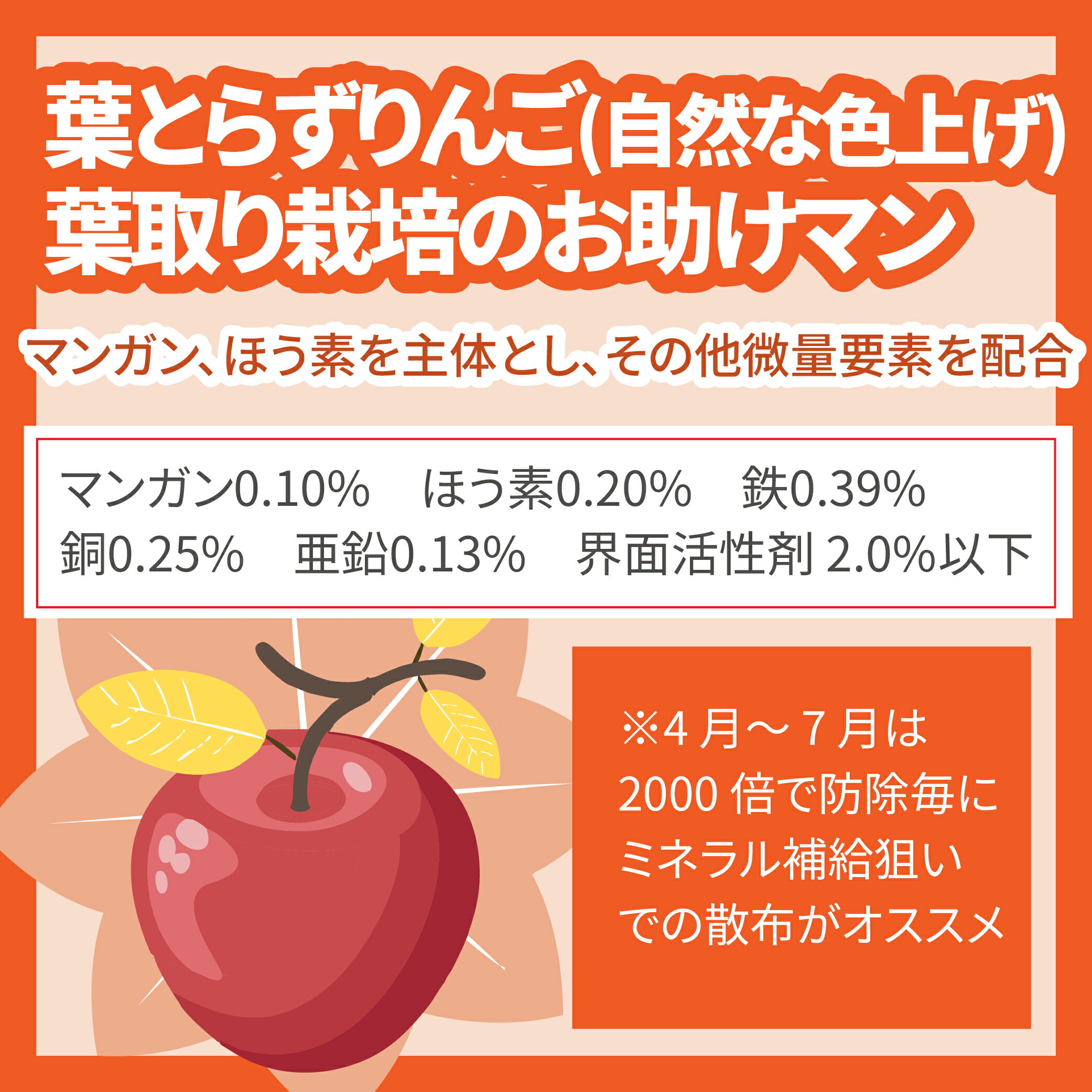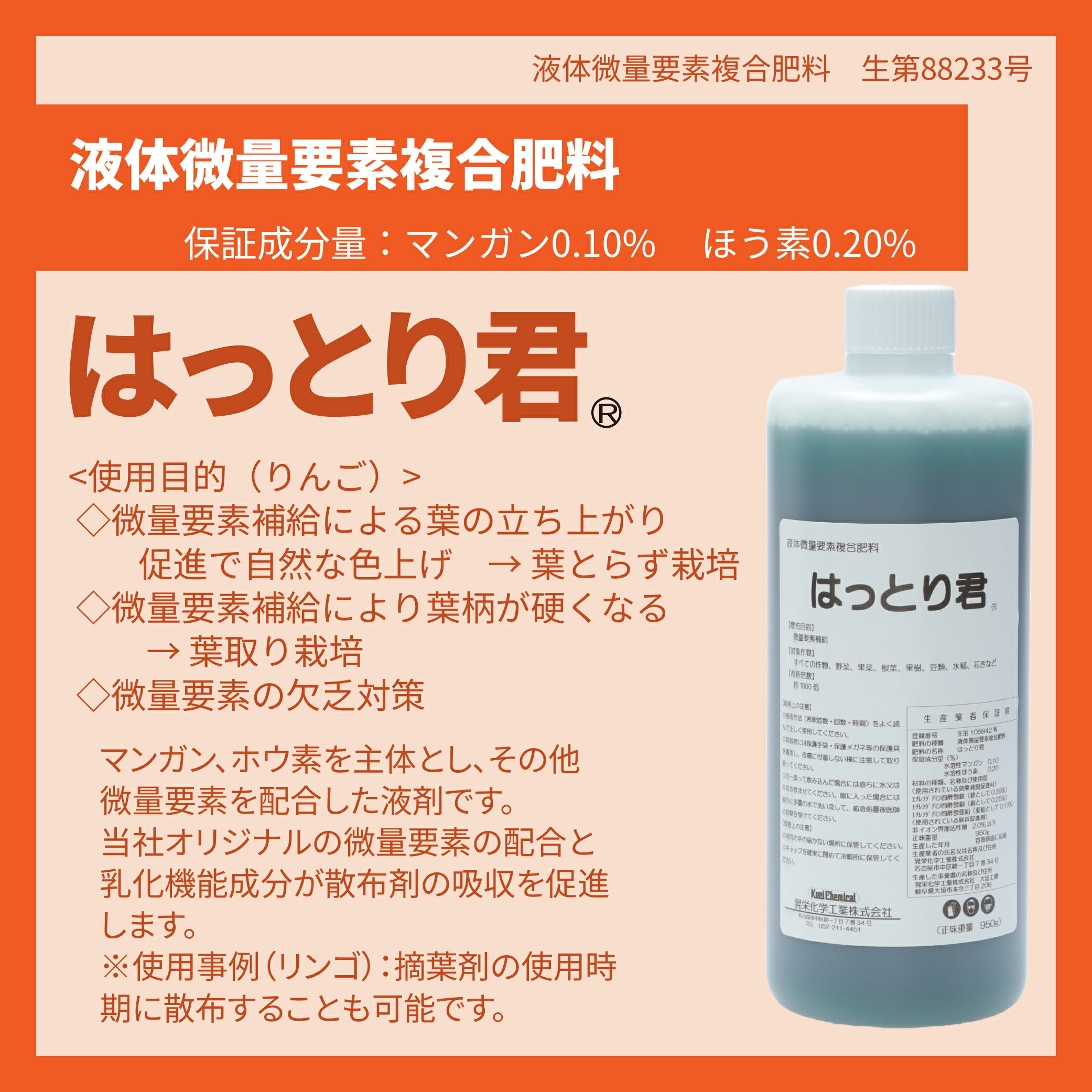 液体微量要素肥料 はっとり君 950g 葉面散布 果樹 りんご 葉とらず(自然な色上げ)葉取り作業の補助 マンガン ほう素 鉄 銅 亜鉛 様々な微量要素を同時補給