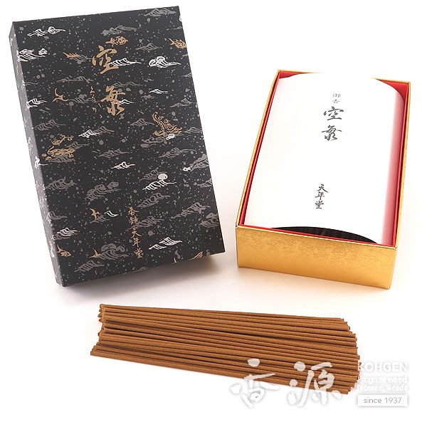 空海は沈香の香りが分かりやすく、よくできた古典的な沈香の香りの香りです。 シャム沈香とタニ沈香と両方の香りがします。 わりと強い、甘い香りがシャム沈香で 下(ベース)に入っている酸味のある香りがタニ沈香です。 あとは様々な古典的な漢薬で調合しております。 当店スタッフ内でも人気のある品で、普段からお部屋でお香として 使っているスタッフもいます。 | こちらの空海はパッケージにもこだわりがあり、 パッケージは空海が袈裟を入れ請来した黒漆に 波紋を一面に描き、怪魚、怪獣、亀など配した蒔絵、 国宝の海賦蒔絵袈裟箱の柄を復元しております。 中の袖紙(お香を包んだ化粧保護紙)は 正倉院蔵庫の飛鳥、鹿、獅子、蝶、飛雲などが描かれた吹絵紙の 復元をしております。 普段使いのお線香にも、御仏前にお供えいただいても、 またお部屋のお香としても大変人気のある品です。 形状:短寸バラ詰 メーカー:天年堂 対象:中級者向き 香り系統:沈香を使った古典的な香り パッケージ:紙箱 本数・個数:約450本 重さ(g):約170g 長さ(cm):約14cm 燃焼時間:約30分 パッケージサイズ:縦15.5cm×横10cm×高さ3.5cm