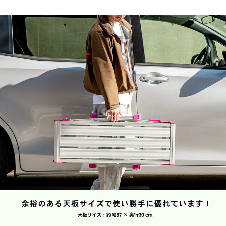 【特長】●洗車に、DIYに、キャンプに、アウトドア必需品の折りたたみ足場台!●屋内・屋外を問わず、幅広く使用できます。【仕様】●サイズ:(約)幅90×奥行き30×高さ60cm●収納時サイズ:(約)幅91×奥行42×高さ14cm●使用時サイズ:(約)幅127.5×奥行き30×高さ60cm●本体重量:(約)4.5kg●耐荷重:(約)100kg●材質 本体:アルミニウム合金(アルマイト処理・ラッカー仕上げ) 脚キャップ:塩化ビニル樹脂●カラー 本体:シルバー 連結部分、脚キャップ:ピンク※色は多少異なる場合がございます。o作業用品 o踏み台・脚立 o洗車台 o新生活・踏み台・脚立