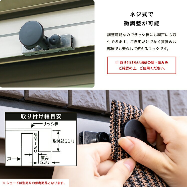 【サイズ】約幅110×奥行30×高さ155mm【仕様】●材質 本体:6ナイロン樹脂・ABS樹脂 取付金具:ステンレス●サイズ:約幅110x奥行30x高さ155mm●カラー:ブラック●耐荷重:3kg/組oエクステリア oガーデン o日よけ oサンシェード oお庭造り・メンテ oフック