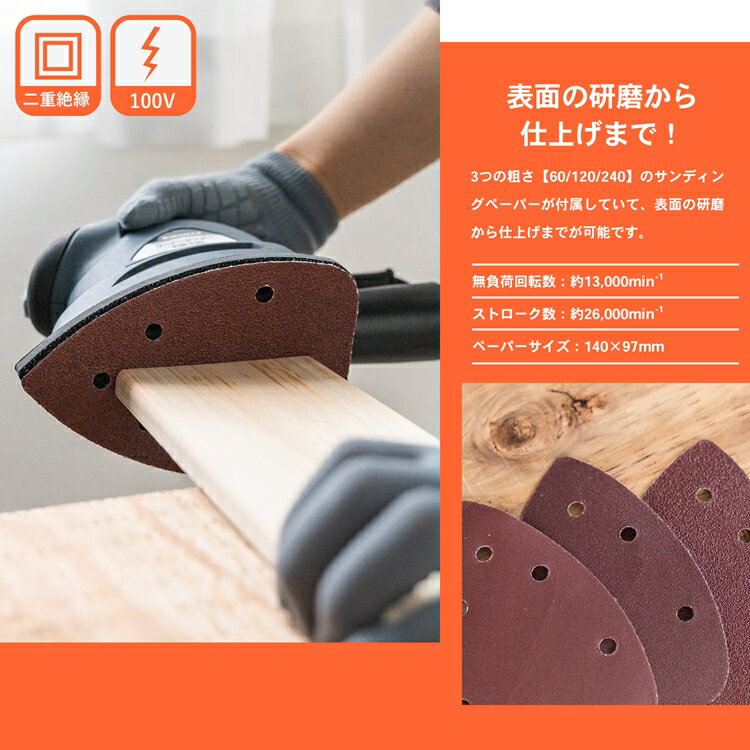【サイズ】約長さ160x幅97x高さ130(mm)【特長】●ホース接続パイプ付●面ファスナー式交換が簡単●アイロン型の先端でコーナーでもしっかりサンディング【仕様】●電圧:AC100V●周波数:50/60Hz●定格消費電力:130W●電流:1.4A●無負荷回転数:約13,000min-1●ストローク数:約26,000min-1●ベースパッドサイズ:約140×97(mm)●接続可能なホース外径:約Φ30〜31mm●定格時間:20分●絶縁方式:二重絶縁●コード長(約):2m●本体サイズ(約):長さ160×幅97×高さ130mm●質量(約):1.1kg●用途:木材・金属のコーナーや狭いところの研磨に【付属品】●ホース接続パイプ×1●サンディングペーパー #60・120・240×各1枚