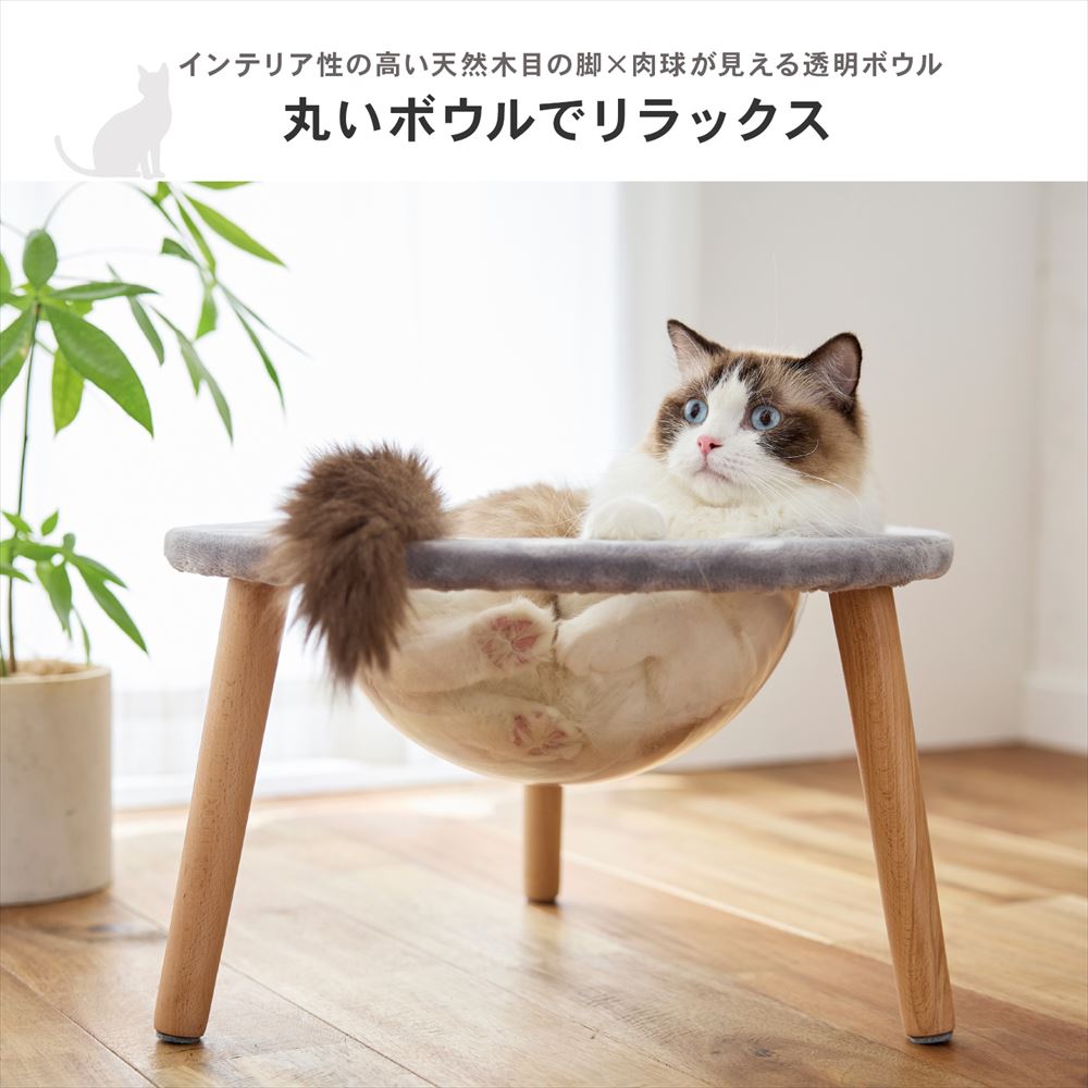 【特長】●丸いボウルでリラックス●インテリア性の高い天然木目の脚●撥水・防水加工生地●かわいい肉球が見える【仕様】●サイズ(約):幅42×奥行42×高さ27(cm)●カラー:グレー●材質 板:パーチクルボード 脚:天然木、フェルト 生地:ポリエステル100%(TPU撥水加工) ネジ:スチール(亜鉛メッキ) ボウル:PET ジョイント部:スチール●耐荷重:8kg ※耐荷重は測定値であり、保証値ではありません。●MADE IN CHINA【使用上のご注意】●猫の遊具・爪とぎとしての用途以外には使用しないでください(本品に腰かけたり、踏み台代わりにするなど絶対にしないでください)。●本品は屋内用です。屋外では使用しないでください。●使用前に破損箇所がないか必ず確認してください。●本品を正しく使用してください。使用方法の誤りや分解・修理・改造などによる事故については、一切責任を負いません。●人やペットが本品に破片や部品などを誤飲しないように注意してください。万一、誤飲した場合は各医師に相談してください。●空袋は小さなお子様・ペットがおもちゃにしないように注意してください。●改造・分解はしないでください。強度が低下し、破損やケガの原因になります。●小さなお子様が本品で遊ばないように十分ご注意ください。●破損や事故の恐れがありますので、人が乗ったり遊んだりしないでください。●お客様の目の届く範囲で使用し、ペットの予期せぬ行動事故などにご注意ください。●過度に負荷がかかりますと破損や転倒の恐れがあります。十分に注意してください。●万一、破損などの異常が見られた場合は直ちに使用を中止してください。●本品にものを載せたまま移動させないでください。●本品を移動する際は両手でしっかり持ち、水平に運んでください。●変色・変形の可能性がありますので、直射日光や高温多湿となる場所を避けて使用・保管してください。●製品の仕様は、改良により予告なく変更になる場合があります。●生地表面の撥水効果は永久的なものではありません。水拭きなどにより徐々に効果は薄まってきますので、日常のお手入れは乾拭きをおすすめします。【備考】※お客様組立品 組立目安時間:1人で5分ボウル型 寝顔 ペット品 猫