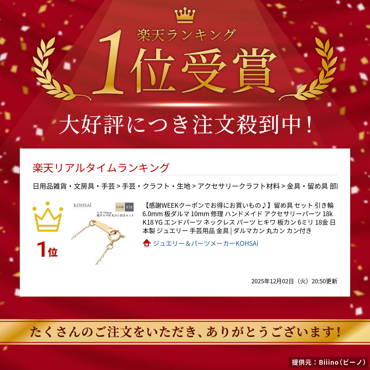 サイズヒキワ=約φ6.0mm 板ダルマ=約10.0mm 丸カン約φ1.5mm素材K18YG=18金商品説明自社工場で一貫製造している、地金の引き輪です。 ネックレスやブレスレット、ストラップ等の製作にご使用ください。 本格派ジュエリーチャームの接続に、ワンランク上のハンドメイドアクセサリーに、アレルギー体質の方の対策におすすめのジュエリーパーツです。 ネックレスやブレスレットの先端に必要な留め具です。 丸カンやチェーン等を通してご使用ください。 付属の丸カンは切って開くか、もう1つ丸カンをかませて使ってください。 当社で全金属パーツにニッケル等の有害金属を一切使用しておりません。ご安心してお使いください。原産国日本(自社工場)注意事項■素材の特性上、大きさに多少の誤差が生じる場合がございます。 ■ゴールドの色みはロットによって多少の差が出ることがございます。 ■商品の撮影には最大限注意を払っておりますが、閲覧時のモニター環境によりましては実際の商品と若干違うお色味に映ることもございます。 ◆使用上のご注意◆ アレルギーの出にくい18金やプラチナ製の商品ですが、体質やご体調によっては、かゆみ・かぶれを生じることがありますので、異常を感じたときにはご使用をお止めいただき専門医にご相談ください。Mサイズ板ダルマとのセット販売です。口閉じ丸カン付き板ダルマと引き輪のセットです。 お手持ちのチェーンと繋げてお使いください。ワンランク上のジュエリー・アクセサリー作りにピッタリ。プロ仕様の18K貴金属パーツです。ジュエリー製作には欠かすことのできない18金の引き輪です。K18の刻印入りとなります。 ごく一般的なチェーンのネックレスやブレスレットに使われる、スタンダードなサイズのヒキワです。 お手持ちのジュエリーの修理やハンドメイドにおすすめです。 口閉じ丸カンつきです。わたしたちKOHSAiが責任を持って作っております!元々あった丸カンは大丈夫ですか?歪んだ丸カンは取り替えましょうサイズ違いの留め具セットもございます\初めての方にはこちらの工具付がおススメ♪/両手で丸カンの口を開けたり繊細な作業をするのにぴったりな工具2個と留め具セット、丸カンもセットに含まれます。 説明書付きで初心者の方にも安心です。ネックレスを作りたい方はこちらをご覧ください選べる金具と1cm単位で長さが指定できる、セミオーダーのネックレスです。