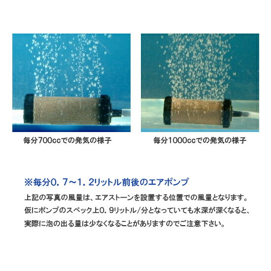 ■いぶきエアストーンの特徴 ・エアストーン全体からムラなく均一に出る細かい泡で、水槽内にすばやく酸素を供給することができます。 ・好気性(酸素が好きな性質)の硝化バクテリアの働きも一層活発になり、水質も良くなります。 ・1200度の高温で焼結したセラミック製品ですので、丈夫で形崩れすることがありません。 ・適度な重量があり、水槽内で水中で動き出す心配もありません。 ★使用前に水に浸けて下さい! 製品の中に空気が残った状態のままでエアを送ると空気が残っているところはエアが通りやすいので、 そこからばかり泡が出ることになってしまいます。 水に浸けて製品の中に残っているエアを全部抜いてください。 ■23φ×60の特徴 ・23φシリーズはもともと業務用として開発された商品です。 ・セラミック部分の直径は約23mm、チューブの差込口まで含めた長さは約80mmです。 ・長さが短いので一般の水槽はもちろんバケツなどでもお使いいただけます。汎用エアストーンとしてお勧めのモデルです。 ・直径が23mmと若干太めですが、両端についたプラスチックパーツのリブで水槽内で転がることもなく設置出来ます。 ・泡の出方も安定していますので、安心してお使いいただくことが出来ます。 ただし、プラスチックパーツがセラミックにかぶる形状になっているため、その部分から少し大きめの泡が出ることがあります。 ■製品仕様 品名 23φ×60 製品寸法直径約23mm×長さ約80mm 製品重量約60g ホース差込口内径4〜5mmのホース用 適正風量2リットル/分 ■エアポンプ風量との関係 どのエアストーンにどの風量のエアーポンプがいいかということはエアストーンのサイズはもちろん、 水深とも大きく関係します。 例えば、風量が1000ccのエアポンプでも、水深20cmでお使いになるのと水深40cmで お使いになるのでは実際の風量が大きく変わりますので、その点もご注意下さい。 ■円柱ストーン製品の名称についての説明例 最初に出てくるφの前の数字はセラミック部分の直径を表します。 そして次に出てくる×の後ろの数字がセラミック部分の長さを表しています。 例えば23φ×100でしたら、セラミック部分の直径が23ミリで、長さが100ミリと いうことになります。 セラミック部分のサイズを表す数字を使っておりますので、実際の商品の大きさは 両端につけるプラスチックパーツの分だけ大きくなっておりますのでご注意下さい。 例えば23φ×100でしたら、プラスチック部分も含めたサイズは 直径27mm、長さ120mmとなります。 上記のように製品名称よりも実際のサイズが大きくなっておりますので、 商品をお選びいただく際にはご自身の水槽に入る大きさかどうか 必ずお確かめいただきますようお願いします。 鯉 錦鯉池 錦鯉水槽 金魚池 金魚水槽 エアーストーン 錦鯉販売 錦鯉通販の大谷錦鯉店 鯉 錦鯉1匹より販売 水槽錦鯉も販売中