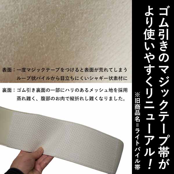 柔軟で巻きやすいゴム引きのマジック白帯 白衣に用いる、最もポピュラーな簡易帯です。 マジックテープ式なのでワンタッチでぴったりと締まります。 また、表裏とも伸縮性に優れた素材ですので、ちょうど良い具合に体にフィットしとても楽。 着付けも簡単で着くずれしません。 帯の裏側には便利な内ポケット付き!カイロや、帯に挟むのでは心配なものを入れるなど、自由ににご使用ください。 ※教師講習の際などにはご使用いただけません。その際は、マジック帯ではなく手で結ぶタイプの帯をご購入下さい。 [2018年春より仕様変更] ・品名がライトパイル帯→マジック帯(マジック白帯)に変更 ・表面素材がループパイルからシャギーに変更し、表地が痛みにくくなりました。 ・裏地の一部にハリのあるメッシュ地を縫い込み、むれにくく、お腹の肉での縦折れがしにくくなりました。 材質表:シャギー/裏:ゴム引き(一部メッシュ) サイズ巾10cm×長さ1M