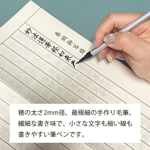 極細の手作り毛筆が生み出す優美な線 奈良筆の老舗メーカーが作った本格的な毛筆タッチの筆ペンです。穂先が直径2mmと非常に細く、写経初心者の方にも最適です。手紙やカードへの繊細な筆記にも向いており、書くたびになめらかな筆の運びを実感できます。 水性顔料インクで鮮やかさを長くキープ 水性顔料インクを使用しており、乾いた後は水に流れることなく、色褪せもしません。長期間保存したい書物や手紙にも安心して使用できます。 商品番号p184商品名極細毛筆「彩」ThinLINE 墨色商品内容1本大きさ商品サイズ:W31×H220×D10mm / 本体サイズ:7径×167mm生産地日本注意事項・使い切りタイプの筆ペンです。カートリッジ式ではありません。・インクの出が悪いときは、しばらく穂先を下にして繰り返し試し書きをしてください。・万一穂先が乾燥したときは、穂先を水で洗い、水分を拭き取りキャップをして2、3日下向きに置いてください。写経道具 極細毛筆 書道用品 繊細文字 手紙用筆ペン 水性顔料インク 初心者向け写経 ペンタイプ毛筆 カード作成ツール 手書きメッセージ 筆文字