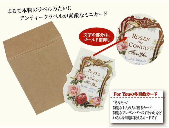 アンティークシリーズ For You-多目的ミニカード アンティーク調のラベルデザインが素敵なミニカードです カードの表面部分は ゴールドの箔押しがしてあります カードの中面は、白の無地です すべてのカードは、For Youです 【For You-あなたへ】 特別な人だけに贈る時に便利なカードです ちょっとしたお礼・おすそわけ・お土産などのギフトに こちらのカードを使用みてはどうでしょうか? カード1枚・封筒1枚 サイズ:約48×71ミリ〜60×63ミリ 封筒サイズ:63×77ミリ(共通) メーカー:ハートアートコレクション 日本製