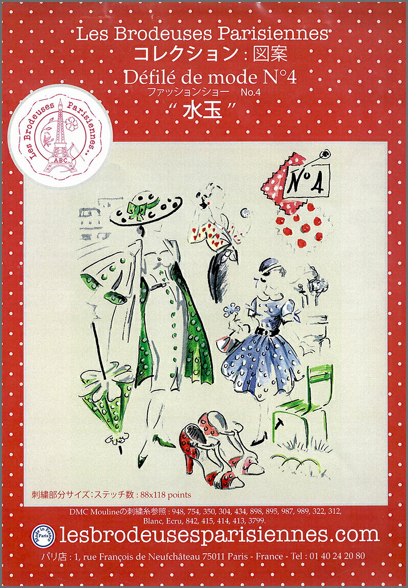 【フランス製】 Les Brodeuses Parisiennes(レブロードズパリジェンヌ) クロスステッチチャート Défilé de mode N°4 "Polka dots"(水玉模様) 図案のみ ポイント数:118x88ポイント 図案:カラー ※こちらの商品は図案のみとなります。 刺繍糸セットは こちらよりお買い求めいただけます。 【ご案内】 ブランドのリニューアルに伴い、 パッケージや図案を印字している用紙が 以前のものとは異なる材質へと変更になりました。 あらかじめご了承くださいますよう、お願い申し上げます。 【著作権について】 この図案を無断でコピー、スキャン等を インターネットに掲載することを禁止します。 【ご返品について】 商品に図面が入っている特性上、 開封された商品の返品はお受けできません。 ご了承くださいませ。