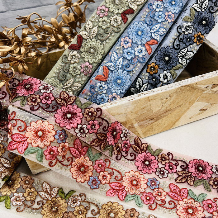 【全品最大2000円OFFクーポン配布中!】【50cm単位】 刺繍リボン インド刺繍リボン リボン 幅約4cm 幅35mm〜幅45mm 花柄 ハンドメイド 手芸用品 材料 ショルダーベルト ストラップ スパンコール チュール地 同系色の美大輪の花々自然の宝石 チュール 240308003
