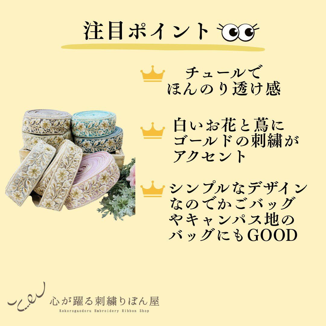 【50cm単位】刺繍リボン インド刺繍リボン リボン 幅約4.5cm 幅40mm〜幅50mm 細幅 花柄 ハンドメイド 手芸用品 材料 ショルダーベルト リメイク ヘアアクセサリー スパンコール チュール地 白い花に魅せられて 250527001