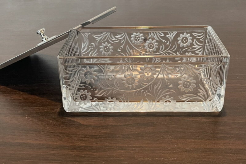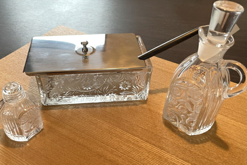 レイシー バターケース ■サイズ:8.8cm×14.7cm×6.5cm ■容量:140ml ■素材:ソーダガラス ■装丁:簡易箱 ■製造:東京都墨田区 数々のガラス製品を手掛ける廣田硝子さんの中でもひときわエレガントなレイシーシリーズのバターケース。 繊細な花柄が施されたバターケースは、朝食でもディナーでもテーブルに映えます。 市販の200gサイズのバターがそのまま入る容量と、バターナイフを入れたまま保管できるように切れ込みが入った蓋など、煩わしさを取り払ったデザインは実用性も抜群です。 ただ何もないテーブルの真ん中にこのバターケースを置くだけで、まるでホテルの朝食ビュッフェの気分。 シリーズをセットでお使いいただければ、いつもの食事もさながらレストランでの食事に感じられるかもしれません。 もちろん単品でお使いいただいても、飾りすぎないシンプルなデザインで食卓に馴染むこと間違いなしです。 もし興味を惹かれたのなら、まずは試しにおひとついかがでしょうか。 お気に召したのなら、是非シリーズで揃えてみてください。 昔ながらのガラスのテーブルウェアで軽やかにコーディネイトすればお料理の楽しさも広がります。トータルでご覧いただけるならこちら「廣田硝子」のシリーズをどうぞ。 今も昔も、ガラスの美しさに魅せられて廣田硝子株式会社 廣田硝子は明治32年、1899年に創業。東京で最も歴史のある硝子メーカーの一つて?す。 近代にヨーロッパから伝わったガラス製造は、日本の美意識と融合し、日本独自のテ?サ?インを開花させました。 廣田硝子は、創業より社に伝わる貴重なデザイン資料を元に、江戸切子や吹き硝子なド脈々と受け継がれる手仕事による伝統的製造を継承し、 現代のインテリアに調和するプロダクトを作り続けています。 特筆すべきは、2002-2007年 廣田達夫氏(3代目)は手作業にこだわり新商品開発を手がけました。大正時代に流行したクラシックグラスの復興に貢献されています。 廣田硝子さんの良さを個人的に語るのであれば、「和ガラス」へのこだわりと申し上げて良いでしょう。 私たちがぱっと思い浮かぶ美しいグラス、といえばバカラやリーデルなどの洋風のグラスブランドではないでしょうか。しかし、原体験の中にはヨーロッパから伝わったガラス文化を日本の生活の中で使っていった歴史があるはずです。廣田硝子さんのうつわやグラスを手に取ると、初めて触れるはずなのにずっと使っていたような・・・あるいは、小さいころに触れたことがあるような・・・そんなあるはずもない記憶の琴線に触れる、少し不思議な感覚に至ります。 古いとか新しい、とか伝統工芸、とかそういった難しいことは置いておき。今の私たちの食卓や、仲間と酌み交わすお酒の席。子供たちにとっておきのデザートを披露するとき。生活の様々なシーンに「あの日の懐かしい」ガラスを取り入れていただけるとうれしいです。 興味のある方は、是非足をお運びください。切子の美しい扉は圧巻でした!2004年 江戸切子の製作工程が学べる体験型施設「すみだ江戸切子館」開設。2017年 江戸ガラスの装飾が学べる体験型施設「すみだ和ガラス館」開館。 雰囲気・用途で探す ちろり / 日本酒グラス 江戸硝子 雪の花シリーズ 昭和モダン 大正浪漫 さまざまな素材から探す 銅製品 - Copper products 鉄製品 - Iron products 錫製品 - Tin products 陶磁器 - Porcelain 木製品 ウッド / Wooden products ガラス器 硝子工芸 / Glass products お確かめ頂きたいこととお願い ・商品の仕様や価格などは、予告なく変更することがございます。 ・すべて熟練の職人が一つずつ丁寧に製作しております。 サイズや容量などの誤差や、小さな気泡が残る場合がございますが、 どうかご容赦頂きますようお願い申し上げます。・ソーダガラス製のグラスは長期間使用しなかったり、環境(気温や湿度、気圧等)によって、グラスが曇ったり、ぬめりを感じたり、酸っぱいにおいがする場合がございます。これはソーダガラスの構成成分である「ソーダ灰」の成分がグラス表面に浮き出てくるためであり、不良品ではございません。ご使用前に中性洗剤などで洗っていただければ、問題なくご使用いただけます。曇り・ぬめりが洗剤で洗っても落ちにくい時は、食酢などを加えると落ちやすくなります。 ・電子レンジや食洗器の使用はお控えください。急な温度変化は割れる危険がありますのでご注意くださいませ。 ・本体と口をセットするときはなるべく水平に差し込んでください。 ・長期間お使いにならない場合はよく洗って乾燥させ、本体と蓋の間に柔らかい紙などをはさんで保管ください。レイシー バターケース ■サイズ:6.2cm×5.3cm×14.2cmH ■容量:140ml ■素材:ソーダガラス ■装丁:簡易箱 ■製造:東京都墨田区 シクラシカルでエレガントな卓上小物が揃う、レイシーシリーズのバターケース。 数々のガラス製品を手掛ける廣田硝子さんの中でもひときわエレガントなレイシーシリーズのバターケース。 繊細な花柄