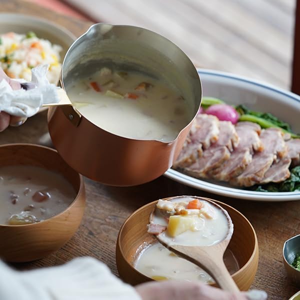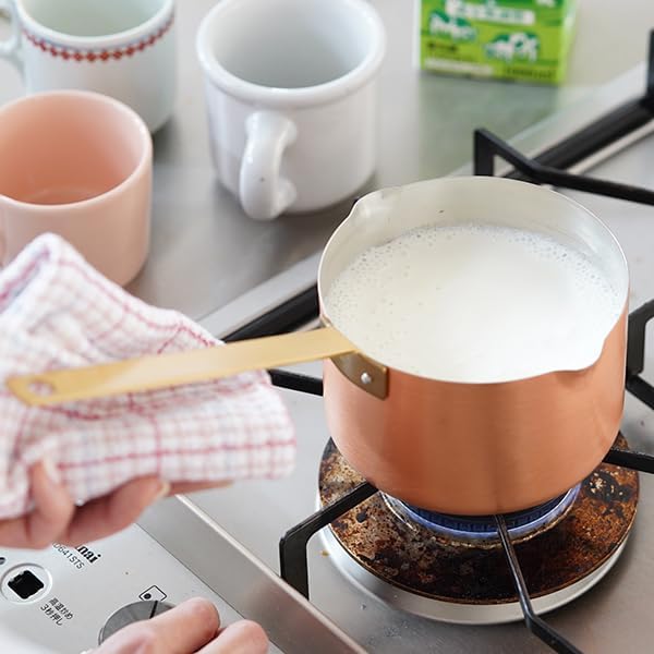 保堂メジャーリングミルクパンL 銅製だから熱伝導率が高く、均一に熱が伝わるので、短時間でお湯などを沸かすことができます。 ブロッコリーなど、少量の野菜を茹でる時も手早くできて便利。日々の暮らしの中で活躍します。。 一般的に流通しているミルクパンの中には、注ぎ口がないものがたくさんありますが、注ぎ口がないと、マグカップなどに直接注ぐのは難しく、周囲にこぼしてしまうこともありますよね。 注ぎ口が付いているため、ミルクなどの液体を注ぎやすく、垂れにくいのも魅力です。 当たり前のように感じるかもしれませんが、重要なポイントです。 なめらかな銅の光沢と、落ち着いた真鍮のコントラストが美しい佇まいは、キッチンに置いてあるだけでうっとり見惚れてしまうほど。 温かい飲み物を飲んでリラックスしたい時などにワンランク上の優雅な時間を演出します。 垂直に立ち上がる端正なフォルムは、へら絞りという製法で作られています。 熱伝導率がとても高いことによりメリットが多くある半面、気を付けなければならないことがあります。 持ち手が熱くなるのです。持つ時はタオルを挟んだり、ミトンなどをお使いください。 商品仕様 ■素材 :本体:銅、内面:錫メッキ ■サイズ :口径120×胴高78×全長280mm、容量 満水約800ml ■重量 :約305g ■製造国 :日本 ■その他スペック :対応熱源(ガス火のみ。IH、電子レンジ、オーブン不可) 食洗機使用不可、空焚き不可 ■お手入れ方法 :重曹または中性洗剤で洗い、よく乾燥させて保管ください。 銅製 鍋のバリエーション 銅製 両口ピッチャー 80ml メジャーリング 銅製珈琲パン 370ml ソースを温めたり、バターを溶かすのに使える おしゃれな銅小鍋はこちら 2杯分のカフェオレを作るのにちょうど良いサイズ 珈琲パンはこちら保堂メジャーリングミルクパンL 銅製だから熱伝導率が高く、均一に熱が伝わるので、短時間でお湯などを沸かすことができます。 ブロッコリーなど、少量の野菜を茹でる時も手早くできて便利。日々の暮らしの中で活躍します。。 一般的に流通しているミルクパンの中には、注ぎ口がないものがたくさんありますが、注ぎ口がないと、マグカップなどに直接注ぐのは難しく、周囲にこぼしてしまうこともありますよね。 注ぎ口が付いているため、ミルクなどの液体を注ぎやすく、垂れにくいのも魅力です。 当たり前のように感じるかもしれませんが、重要なポイントです。 なめらかな銅の光沢と、落ち着いた真鍮のコントラストが美しい佇まいは、キッチンに置いてあるだけでうっとり見惚れてしまうほど。 温かい飲み物を飲んでリラックスしたい時などにワンランク上の優雅な時間を演出します。 垂直に立ち上がる端正なフォルムは、へら絞りという製法で作られています。 熱伝導率がとても高いことによりメリットが多くある半面、気を付けなければならないことがあります。 持ち手が熱くなるのです。持つ時はタオルを挟んだり、ミトンなどをお使いください。 商品仕様 ■素材 :本体:銅、内面:錫メッキ ■サイズ :口径120×胴高78×全長280mm、容量 満水約800ml ■重量 :約305g ■製造国 :日本 ■その他スペック :対応熱源(ガス火のみ。IH、電子レンジ、オーブン不可) 食洗機使用不可、空焚き不可 ■お手入れ方法 :重曹または中性洗剤で洗い、よく乾燥させて保管ください。 銅製 鍋のバリエーション 銅製 両口ピッチャー 80ml メジャーリング 銅製珈琲パン 370ml ソースを温めたり、バターを溶かすのに使える おしゃれな銅小鍋はこちら 2杯分のカフェオレを作るのにちょうど良いサイズ 珈琲パンはこちら