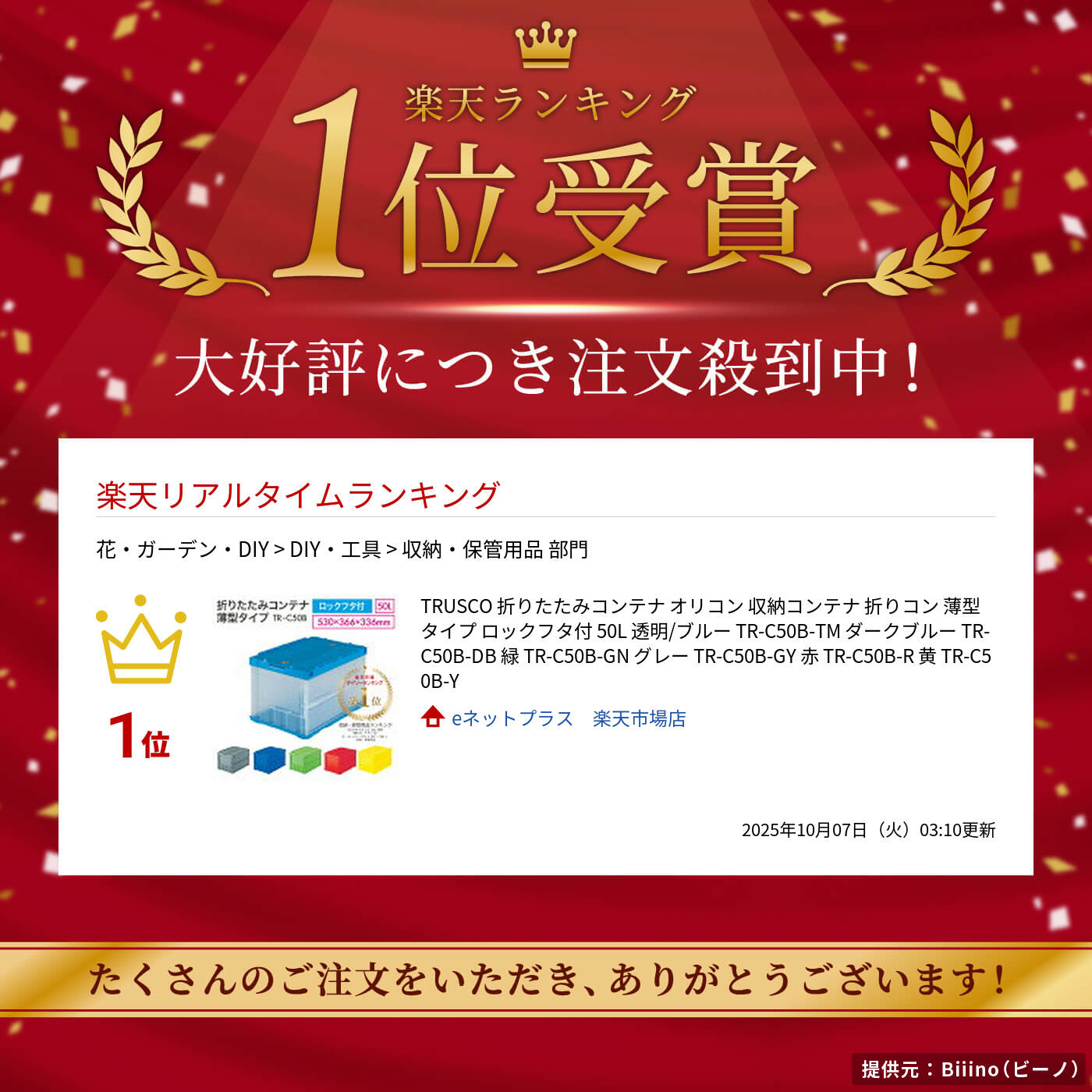 《スーパーSALE期間 10%OFF》TRUSCO 折りたたみコンテナ オリコン 収納コンテナ 折りコン 薄型タイプ ロックフタ付 50L 透明/ブルー TR-C50B-TM ダークブルー TR-C50B-DB 緑 TR-C50B-GN グレー TR-C50B-GY 赤 TR-C50B-R 黄 TR-C50B-Y