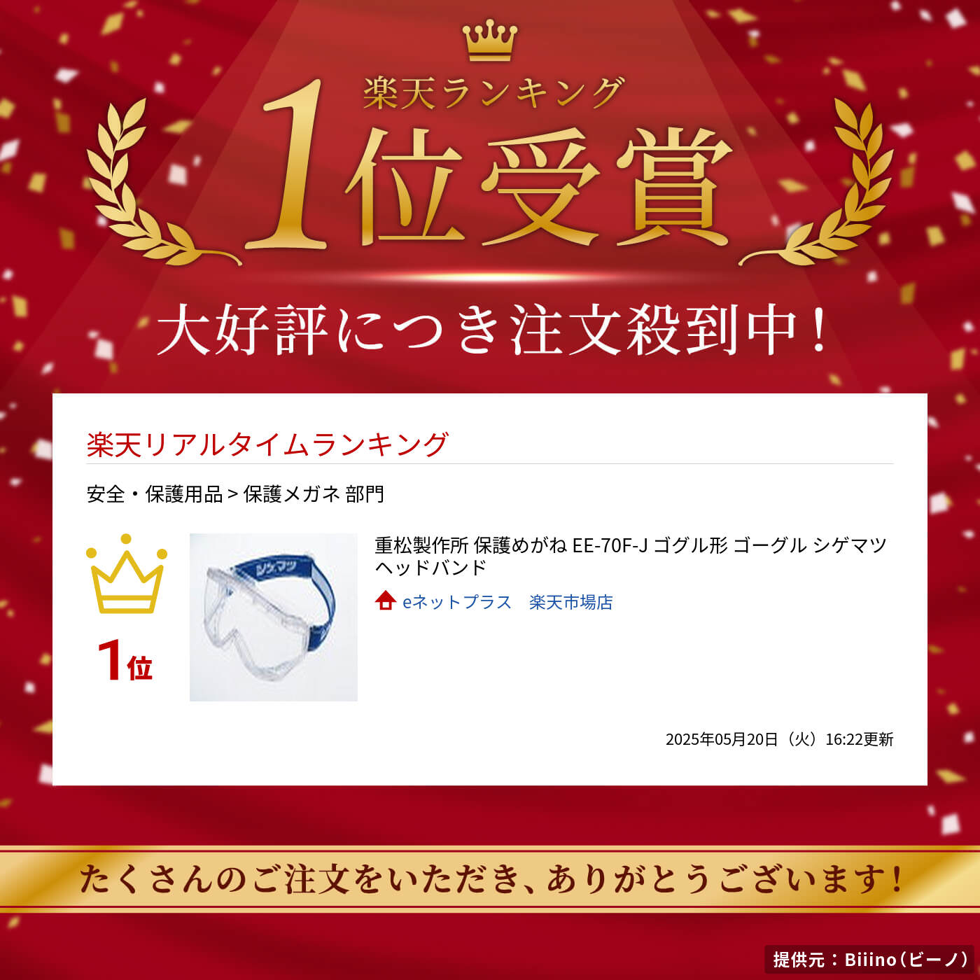 重松製作所 保護めがね EE-70F-J特長・ゴーグル型 ・サイドまであるアイピースで広視野 ・ヘッドバンドは装着感の良いゴム織紐仕様形状:ゴーグル型 機能:マスク・視力矯正用めがね併用可、曇り止め加工、紫外線カット、 表面硬化処理、ベンチレーター(換気口)付 質量(g):113g以下 規格:JIS T 8147:2016、EN 166:2001 レンズ色:クリア 材質:レンズ ポリカーボネート フレーム ポリ塩化ビニル用途・滅菌・消毒作業 ・CBRN災害レベルD ※総務省消防庁「化学災害又は生物災害時における消防機関が行う活動マニュアル」による。 ・火山灰対策 ・リフラクトリーセラミックファイバー(RCF)等を用いた特殊な作業等の管理 ・建築物等の解体・改修工事のがれき処理 ・PM2.5、黄砂、花粉、ハウスダスト等 ・ナノマテリアルの製造・取扱い作業 ・インジウム化合物対策 ・除染作業対策 ・感染症対策 ・石綿(アスベスト)関連作業 ・ダイオキシン類対策用 ・農薬散布作業 ・家畜検査 ・浮遊粉じん・液体飛沫防止・その他一般作業(飛来物等)