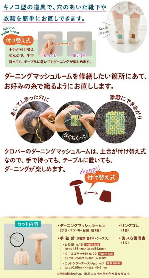新セットは以下より 【クロバー】 Darning Mushroom set ダーニング マッシュルーム セット ボックス 57-920 【クロバー】 Darning yarn set ダーニング糸セット color1 color2 ★ダーニングマッシュルーム スターターセット★ ◆本付き◆のセットです。 ダーニングマッシュルーム×1個 ダーニングヤーン×3個 ※ダーニングヤーンはカラー選択肢より、お好きなカラーをお選び下さい。 ダーニングマッシュルームの本×1冊 刺しゅうみたいにかわいくお直し。 ダーニングとは、ヨーロッパで伝統的に行われている、 衣類の穴あきやすきりれた箇所を修繕する針仕事です。 そんなダーニングの作業に欠かせないのが、 キノコ型の道具、ダーニングマッシュル−ム。 マッシュル−ムで刺しゅうみたいに可愛くお直ししましょう。 土台が付け替え式なので、 手で持っても、テーブルに置いてもダーニングが楽しめます。 使い方はマッシュルームを衣類の修繕箇所にあて、 お好みの毛糸で織るようにお直しします。 ◆『ダーニングマッシュルーム』について ダーニング マッシュルーム(かさ・ハンドル・台座 各1個) 手芸針3種類 各1本・ケース入 (とじ針 No.15 クロスステッチ針 No.22 (57-202) コットンダーナーズ(先丸) No.7) リングゴム1個 使い方説明書 パッケージサイズ:80×150×80mm 素材: ダーニングマッシュルーム:天然木(オーク材)、鉄 手芸針:鋼(ニッケルメッキ) 針ケース:オレフィン系樹脂 リングゴム:(糸)ナイロン(ゴム)天然ゴム ◆『ダーニングヤーン』について お好きなカラーを3色お選び下さい。 ダーニングに適したウール調で細い糸。 あいてしまった穴、シミ、生地のへたりの修繕に。 生地の厚さに合わせて、1本取・2本取にするなど調整してください。 【材質・内容】 ウール50%・アクリル50% 3色入 各約16m巻 【パッケージサイズ】 70×115×8mm ◆『ダーニングマッシュルームの本』について ダーニングマッシュルーム〈付け替え式〉を使った作品集です。 ダーニングマッシュルーム〈付け替え式〉を使ってのおしゃれな補修はもちろん、ダーニングマッシュルームの「かさ」や「ハンドル」部分を使った既製服への刺しゅうも提案しています。 ●サイズ:149×210×1.5mm ●24頁 ※ゆうパケットNG! ※実際の色目と多少異なる場合がございます。 ※ネジを最後まで締めた状態でご使用下さい。 ※用途以外のご使用は、おやめください。 ※お子様の手の届かない所に保管して下さい。 ▼単品はこちらから 【クロバー】Darning yarn ダーニング糸 【クロバー】Darning yarn ダーニング糸 新色 NEW!【クロバー】Darning yarn natural ダーニング糸ナチュラル 【クロバー】Darning Mushroom ダーニング マッシュルーム 【クロバー 71-321】ダーニングマッシュルームでリペア&刺しゅう メーカー希望小売価格はメーカーサイトに基づいて掲載しています