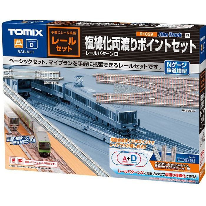 SEARCH WORD:鉄道模型 エヌゲージ Nゲージ 電車模型 列車模型 ジオラマ 電車 列車 玩具 おもちゃ 模型 コレクション 趣味 ホビー 車両 車体 トミーテック tomix トミックス商品概要:TOMIX入門者用レールセット です。PCまくら木採用のベーシックSD・マイプランLTに加えて、レイアウトを複線化して合成樹脂製のまくら木のダブルクロスポイントの両渡り線を楽しむためのレールパターンDのセットです。各単品を買い足した価格よりもお得な設定で、収納性にも配慮したセットになっています。■複線化するためのセットで外線と内線を車両が行き来できるダブルクロスポイントを備えた複線レイアウトが組める■パッケージは環境に優しい紙製※本セットのみでは遊べません商品仕様:■メーカー:トミーテック■JANコード:4543736910299■商品名:Nゲージ レールセット複線化 両渡り ポイントセット 鉄道模型 線路 TOMIX TOMYTEC■型番:91029■スケール:Nゲージ■製品内容:【レール】●ストレートPCレールS140-PC(F) x1●ストレートPCレールS280-PC(F) x3●リレーラーPCレールS140-RE-PC(F) x1●カーブPCレールC317-45-PC(F) x8●カーブPCレールC541-15-PC(F) x4●電動合成枕木ポイントN-PX280-SY(F) x1【制御機器】●ポイントコントールボックスN-W x1●D.C.フィーダーN x1●分岐コード(フィーダーN用) x1■ご注意事項:※製品の仕様や価格は予告なく変更する場合があります。※掲載している画像は、実際の製品と一部異なる場合があります。※製品のパッケージ(外箱やスリーブ等)は本体を保護する目的となり、運搬におけるダメージについては不良交換の対象外となります。※商品概要、仕様、サービス内容及び企業情報などは商品発表時点のものです。※最新の情報に関しましては、メーカーサイトをご覧ください。※発売前予約商品についてはメーカーの商品製造数により納期が遅れる場合やご注文キャンセルをお願いする場合がございます。
