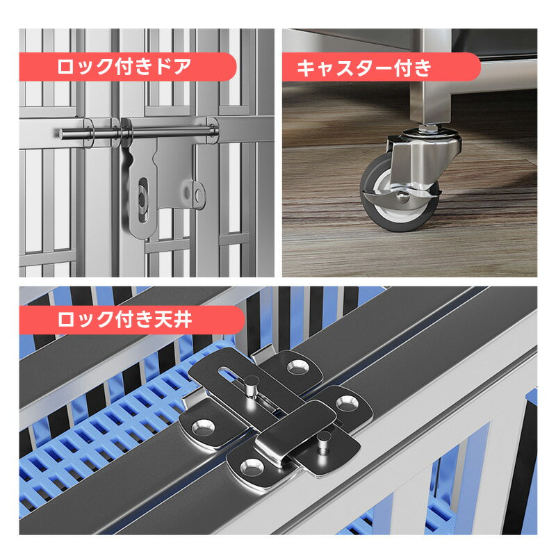 ■素材:ステンレス ■サイズ: 78*50*66cm(エサ扉は付いていません) 94*65*81cm(エサ扉は付いていません) 108*70*96cm 120*75*106cm 120*95*106cm 147*95*116cm ※手作業での採寸となりますので、若干の誤差が生じます。 ※スノコの大きさはケージの底部と完全同じではありません。予めご了承ください。 ■商品説明: 6サイズで小型犬から大型犬まで対応可能 頑丈な厚手ステンレスで重さに強い設計 簡単3ステップで折り畳み、場所を取らずに収納OK 取り外し可能なトレーで簡単に掃除できます。 ブレーキ付き360°回転キャスターで、安全かつ簡単に移動可能。 アウトドアやリビング、バルコニーなど、さまざまな場所で活躍します。 ■ご注意: ◇お送りする商品は、傷などができないよう充分に注意して梱包しておりますが、素材の特性や運送状況などにより、小傷(凹み)や汚れが発生する場合があります。 不良ではありません、ご使用には問題がありません。 少しでも気になる方はご購入をお控えくださいませ。 ◇サイズは、実寸サイズを測っているため多少誤差がでる場合があります。 以上ご了承の上ご購入下さい。