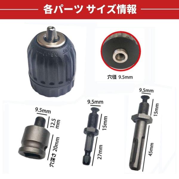 キーレス ドリルチャック 1/2 電動ドライバー 0.8-10mm SDS軸 六角軸 アタッチメント ソケットアダプター 電動工具 職人 電気設備 作業中でも素早い交換!ドリルチャック こちらは電動ドライバー用のキーレスドリルチャック。【キーレスタイプ】キーハンドルが無くても、本体を回転させるだけでチャックが開閉するデザインを採用。チャック部は抜群の高精度・保持力で先端工具をがっちり締めることができます!【素早い交換が可能】ドリルチャックを取り付けることで、交換時の専用工具が不必要に!作業中でも素早い交換ができ、時短になります(*^^*)忙しい職人さん、大工さん、電気工事、設備工事や内装工事に携わる方また日曜大工やお父さんにお勧めです!他にもハンドメイドキーホルダーの穴あけやアイテムを作成される方にもおすすめです。【アタッチメントアダプター3種】・六角軸シャンク インパクトドライバーなど・SDSシャンク 電動ドライバー、ハンマードリルなど・レンチアダプター インパクトレンチなど様々な工具にご装着いただけます汎用ドリルや軸付砥石サンドペーパー、スポンジ、などで作業が可能になります。 5