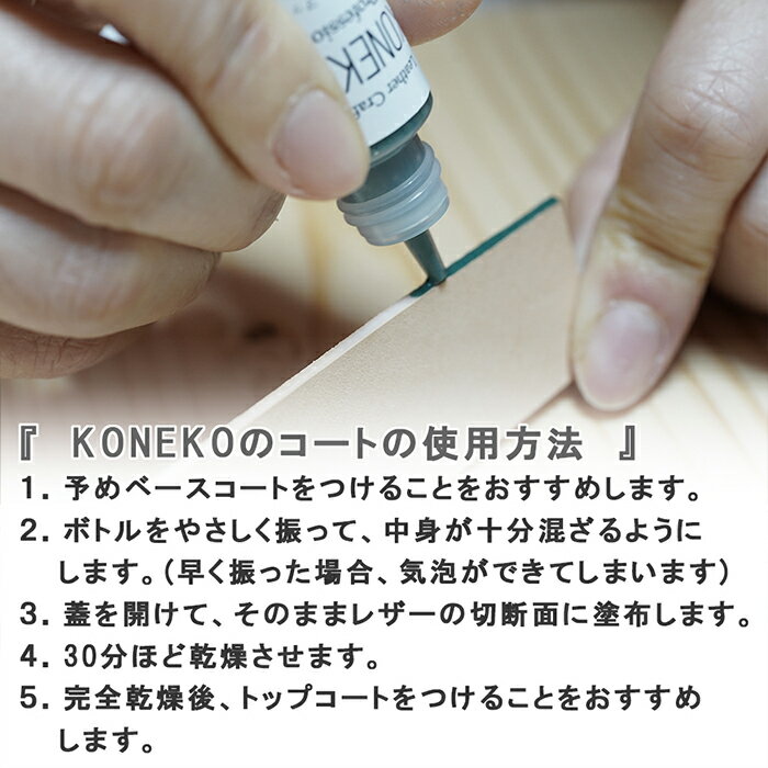 商品について 特徴 革の切断面のコバをきれいに処理するレザークラフト用コバ液です。コバに塗る色は、素材の革と同じ色か、革より少し濃いめの色にすると作品全体がナチュラルにまとまります。同系色ではなく、革本体とは異なるカラーを塗って、アクセントにしてもおしゃれです。 本製品には、合成樹脂が含まれます。塗布部分に膜を張り、膜の分だけ盛り上がり、革を保護します。 用途 コバ(革の切り端)への接着力が高く、柔軟性に優れます。 また日焼け・水にも強く、長く美しい発色を保ちます。 内容 樹脂水性顔料 ・基本色 その他 当店で販売中の材料用品の送料はご注文1回につき、1度だけいただきます。 いろんな商品をご購入いただいたら、商品ごとにではなく、ご注文1回分につき1度のみご負担いただきます。