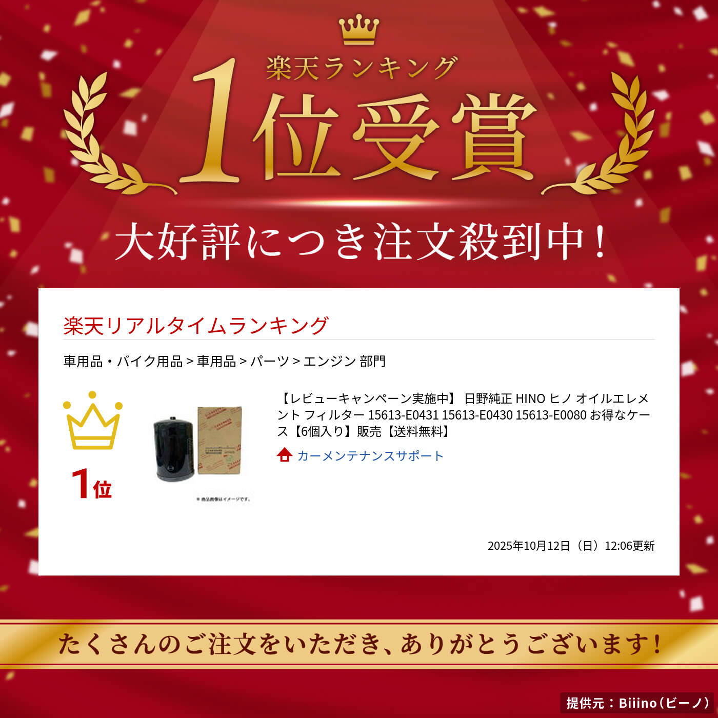 【レビューキャンペーン実施中】 日野純正 HINO ヒノ オイルエレメント フィルター 15613-E0431 15613-E0430 15613-E0080 お得なケース【6個入り】販売【送料無料】