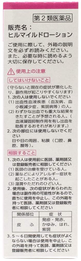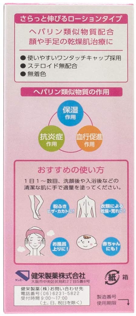 ■製品特徴 さらっと伸びるローションタイプ ヘパリン類似物質配合 顔や手足の乾燥肌治療に ●使いやすいワンタッチキャップ採用 ●ステロイド無配合 ●無着色 ■使用上の注意 ■してはいけないこと■ (守らないと現在の症状が悪化したり,副作用が起こりやすくなります) 1.次の人は使用しないでください (1)出血性血液疾患(血友病,血小板減少症,紫斑病等)の人。 (2)わずかな出血でも重大な結果をきたすことが予想される人。(血液凝固抑制作用を有し出血を助長するおそれがあります。) 2.次の部位には使用しないでください 目や目の周囲,粘膜(口腔,鼻腔,膣等)。 ▲相談すること▲ 1.次の人は使用前に医師,薬剤師又は登録販売者に相談してください (1)医師の治療を受けている人。 (2)薬などによりアレルギー症状を起こしたことがある人。 2.使用後,次の症状があらわれた場合は副作用の可能性があるので,直ちに使用を中止し,商品の外箱を持って医師,薬剤師又は登録販売者に相談してください [関係部位:症状] 皮ふ:発疹・発赤,かゆみ,はれ,紫斑 3.5〜6日間使用しても症状がよくならない場合は使用を中止し,商品の外箱を持って医師,薬剤師又は登録販売者に相談してください ■効能・効果 手指のあれ,ひじ・ひざ・かかと・くるぶしの角化症,手足のひび・あかぎれ,乾皮症,小児の乾燥性皮膚,しもやけ(ただれを除く),傷・火傷のあとの皮膚のしこり・つっぱり(顔面を除く),打ち身・捻挫後のはれ・筋肉痛・関節痛 ■用法・用量 1日1〜数回,適量を患部にすりこむか,又はガーゼ等にのばして貼ってください。 【用法関連注意】 (1)用法用量を厳守してください。 (2)小児に使用させる場合には,保護者の指導監督のもとに使用させてください。 (3)目に入らないように注意してください。万一,目に入った場合には,すぐに水又はぬるま湯で洗ってください。なお,症状が重い場合には,眼科医の診療を受けてください。 (4)外用にのみ使用してください。 ■成分分量 100g中 ヘパリン類似物質 0.3g 添加物として セトステアリルアルコール,白色ワセリン,グリセリン,2,2',2''-ニトリロトリエタノール,軽質流動パラフィン,スクワラン,ステアリン酸ポリオキシル40,モノステアリン酸グリセリン,カルボキシビニルポリマー,パラオキシ安息香酸プロピル,パラオキシ安息香酸メチル を含有します ■剤型:液剤 ■保管及び取扱い上の注意 (1)直射日光の当たらない涼しい所に密栓して保管してください。 (2)小児の手の届かない所に保管してください。 (3)他の容器に入れ替えないでください。(誤用の原因になったり品質が変わることがあります。) (4)使用期限を過ぎた製品は使用しないでください。 【お問い合わせ先】こちらの商品につきましては、当店(ドラッグピュア)または下記へお願い申し上げます。 健栄製薬株式会社 電話:(06)6231-5822 受付時間:9:00〜17:00(土,日,祝日を除く) 広告文責:株式会社ドラッグピュア 作成:202204SN 神戸市北区鈴蘭台北町1丁目1-11-103 TEL:0120-093-849 製造販売:健栄製薬株式会社 区分:第2類医薬品・日本製 文責:登録販売者 松田誠司 使用期限:使用期限終了まで100日以上 ■ 関連商品 健栄製薬 お取り扱い商品 ヘパリン類似物質
