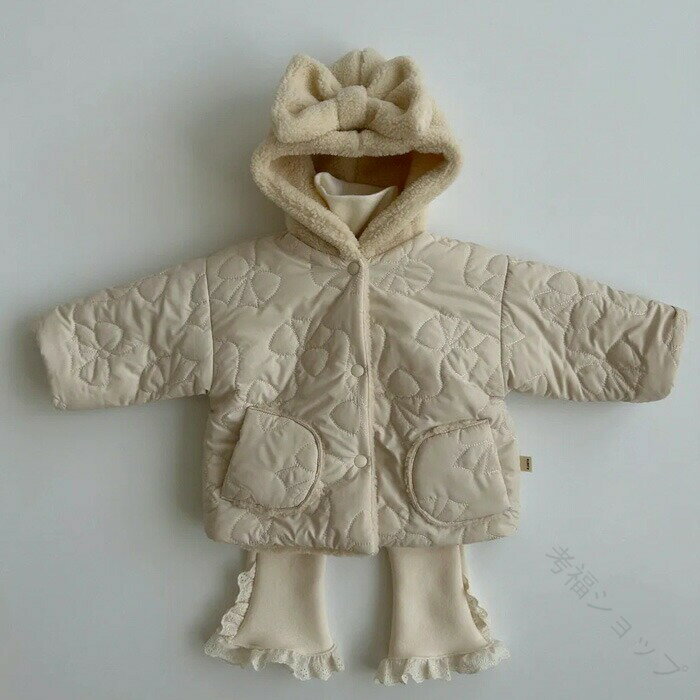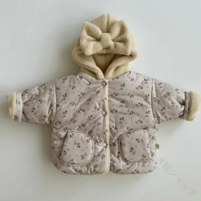 ボアコート キッズ ベビー服 子供 赤ちゃん 女の子 秋冬アウター フード付きリボン帽子 裏起毛ジャケット ナチュラルシンプル 子供服 新生児用 おしゃれかわいい ボア花柄無地冷え対策 73 80 90 100cm対応