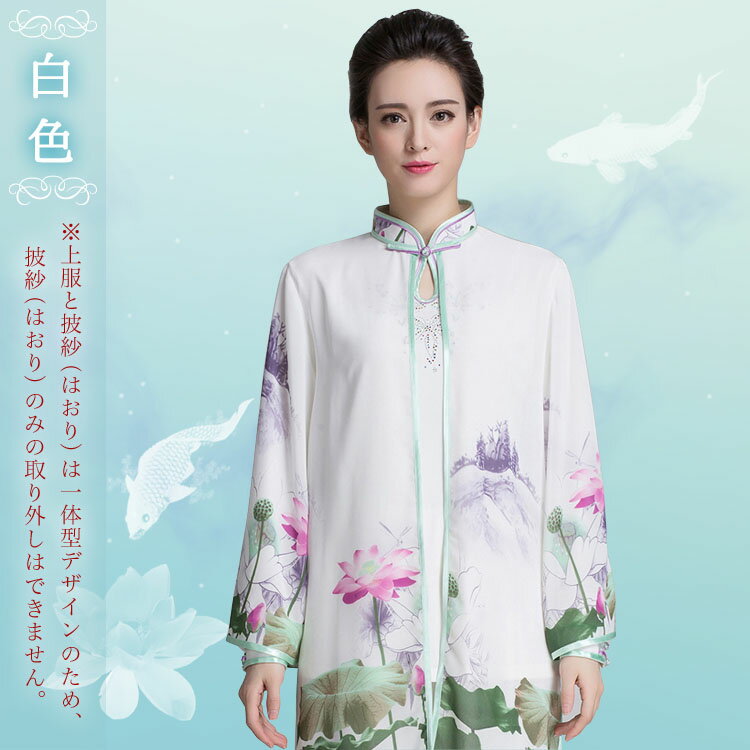 商品詳細 商品名 古韻 春秋披紗太極拳服 素材 披紗(はおり):シフォン 上服、ズボン:麻35%、綿65% カラー 白色、ピンク色、水色 セット内容 上下2点セット(上着・パンツ)※披紗(はおり)は取り外し不可 サイズ XS、S、M、L、XL、XXL 商品説明 披紗(はおり)を羽織っているような一体型デザイン。※披紗(はおり)のみの取り外しはできません。 独自の美しいプリント柄を、柔らかくて軽やかなシフォン生地に施しております。 通気性のよい吸汗速乾に優れた素材なので、肌触りが良くいつも快適な着心地です。 上品で美しいデザインを職人の精巧な縫製で仕上げています。 洗濯方法 ■ 手洗い推奨。洗濯機で洗う場合は、必ず洗濯ネットに入れて洗ってください。 ■ 濃い色のものは色落ちする場合がありますので、他のものと一緒に洗わないでください。 ■ お洗濯の際、塩素系漂白剤・タンブラー乾燥機のご使用は避けてください。 ■ アイロンを使う場合は、低〜中の温度設定で、当て布を上からかけてください。 注意事項 ※お客様の身長と体重のデータを元にお作りするオーダー注文のため、身長と体重を必ずお知らせください。 ※納期は1〜2週間程になります。 ※商品の特性上、ご注文後の変更及びキャンセルはできません。 また、商品到着後に「イメージが違った」等の理由での返品はできません。予めご了承ください。
