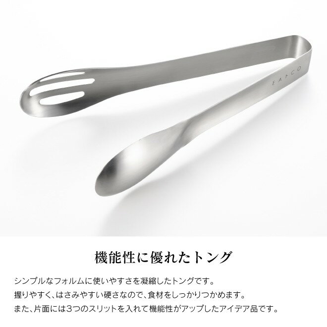 【お知らせ】 一部の商品は、在庫数を超えてご注文いただける設定となっております。 在庫数を超えてご注文いただいた場合は「お取り寄せ」となり、商品ページに記載の配送予定日よりもお時間をいただく形になります。 納期はご購入手続き前の「買い物かご」にてご確認いただけます。 ※メーカー欠品になりにくい商品を選んで設定していますが、稀に遅延や欠品となる場合がございます。その際はできる限り早くご案内いたしますが、確認に時間がかかる場合もあります。 燕三条製オールステンレスの万能トング。 【品名】Hasam(トング) 【サイズ】約W35×D200mm 【重量(約)】70g 【素材】18-0ステンレス 【生産地】日本(新潟県燕市) ● お手入れ方法 ・最初に使用するときは食器用洗剤をつけたスポンジで洗ってから使用してください。 ・使用後は食器用洗剤をつけたスポンジで洗ってください。 ・塩分や油脂分を含んだ汚れが付いたまま放置したり湿気の多い場所で保管しないでください。 ・鉄やアルミ等の異種金属と接触したまま放置しないでください。 ● ご使用上の注意 ・無理に広げる、荷重をかける等しないでください。機能を損ないます。 ・幼児の手の届かないところで使用・保管してください。【EAトCO(イイトコ)】金属加工の街として有名な新潟県燕市でクッキングツールを作るブランド「EAトCO/イイトコ」。楽しく料理をつくる、そして楽しく食べる。テーマは「 EAT+COOKING 」。キッチンでは、クッキングするための扱いやすさを、ダイニングでは、料理を盛りつけたときの美しさ、サーブのしやすさなどを十分に考えて作られている。使って、置いて、どんどん愛着が湧き、「つくる+食べる」をますます楽しいコトにしてくれるクッキングツールです。