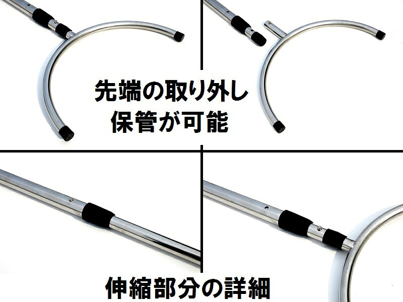 ※ 大量注文をご検討の方は、ご連絡下さい。 在庫および納期を確認させていただきます。 ※ 沖縄県 および 離島の方は、別途、追加送料が発生します。ご了承ください ■ さすまた 伸縮タイプ強化型 ■ 軽くて、とても長く伸びる。スコップの握りが付いて、力を入れられる。 ■ サイズ 収納時約 131cm 使用時約 203cm■ 先端部を外し、分解収納もできます。 全長約 108cmになります。■ 又部分の最大幅約 47cm ■ 握り部分のパイプ直径 約35mm ■ ステンレス製■ 重量 約1230g ◇ さすまたは、外為法上で武器に分類されるため、輸入に際し経済産業大臣の承認および、輸入許可を受けなければなりません。 当社の製品は、「正規の手続きにより承認されたものです。」公共施設などでも安心して設置できます。 ◇ この商品は、銃刀法による所持許可証は「必要ありません。」 施設などに保管することができます。■ プッシュボタン式で収縮可能。 ■ 最大に伸ばした時に、ロックします。 握り部分と、又部分が水平でボタンがロックします。■ 対象者の腰のあたりに向けて押すように使用します。 ■ 防犯目的以外の用途に使用できません。 ■ 梱包は、緩衝材と共にビニールに包んでのお届けとなります。■ 商品保管中、輸送中に擦れ等ができる場合があります。ご了承ください。 ※送料につきまして。 沖縄県、離島の方は別途料金 3,500円が追加となります。 ご了承ください。 ■ 関連商品もいろいろ取り揃えております。 安全用品関係 ・さすまた 各種取り扱い中 ・護身用 盾 各種取り扱い中 ・防刃ベスト ・捕獲網