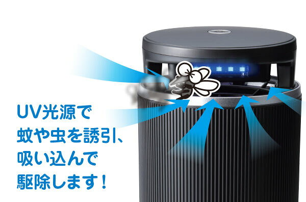 【特長】 ●蚊や虫を誘引する波長域360〜400nmを発生するLEDランプを使用しています。黒色を好む蚊の習性を利用し誘引効果を高めます。 ●光に近づいた蚊や虫を内蔵のファンで本体内部に吸い込みます。本体内に入った蚊や虫はファンで乾燥させ、死滅させます。 ●電気代は1時間で約0.14円、長時間使用で経済的です。また化学薬品や殺虫剤を使用しないので、小さなお子さんやペットがいる場所でも安心して使用できます。 ●運転音が気にならない静音タイプ。就寝中も気になりません。 ワンタッチスタートの簡単操作。 【仕様】 ●使用ランプ:0.5W LED×10 ●定格入力:AC100V-240V ●定格出力:DC12V 800mA ●定格周波数:50/60Hz ●消費電力:7W ●運転音:約35dB ●質量(kg):0.6