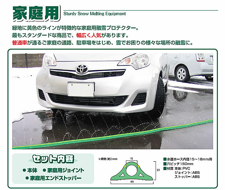 【特長】 ●水道ホースを接続して簡単に融雪ができます。 ●弾性特殊配合樹脂製で、自動車の通行する場所で使用可能です。(普通乗用車まで) ●巻き取って片付けられるので、収納場所を取りません。 【用途】●消雪設備のない場所での簡易融雪装置。 ●駐車場、屋外通路などの融雪・散水に。 【仕様】 ●両側散水 ●内径×長さ(mm×m):15×10 ●適合ホース内径(mm):15〜18 ●質量(kg):2.2 【セット内容・付属品】 ●本体1本 ●家庭用ジョイント1個(KUP-J) ●家庭用エンドストッパー1個(KUP-E) 【使用条件】 ●製品同士を接続・延長可能な散水有効長は、給水部から最大20mまでです。 ●延長するほど給水側と末端側で散水量の差が大きくなります。 ●車が通過する際は徐行し、大型車や重機が通る所では使用しないで下さい。 ●チェーン等を装着したタイヤでの通行は避けてください。 ●ジョイント部は車で踏むと破損する恐れがあります。 【納期】メーカ取り寄せのため、約3日(営業日)で出荷します。 画像clickで各商品販売ページに進みます 融雪プロテクター《家庭用》 片側散水 3m 片側散水 5m 片側散水 10m 両側散水 3m 両側散水 5m 両側散水 10m エンドストッパー ジョイント L型ジョイント T型ジョイント