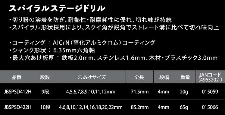 ☆ロブテックス JBSPSD422H J-CRAFT99 10段 スパイラルステージドリル 黒 ブラック