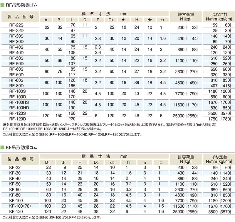 【特長】 ●管類ダクト・機械装置を天井から吊り下げる場合に使用 ●軽荷重から大荷重まで幅広く対応できます ●防振ゴムとハンガーが一体のため、取付作業が容易です ●ダブルナットの取付けが可能 ※RF-100HS、100HD、120S、120Dはハンガーと防振ゴムは一体型ではありません 【仕様】 図参照 ※画像は代表画像(イメージ)を使用しています。お客様で条件をご選択いただいたものをご用意しますので、仕様等をメーカーカタログ・HPなどを参考にお客様側で慎重にご確認の上ご注文ください(注文間違いによる返品交換不可) 【納期】 メーカーに在庫があれば、納期約3~4日(営業日)で出荷いたします 画像clickで各商品販売ページに進みます 防振ゴム KA KB KC KD KE KH KI KJ KLB KN KR KUB RA RB RI RF