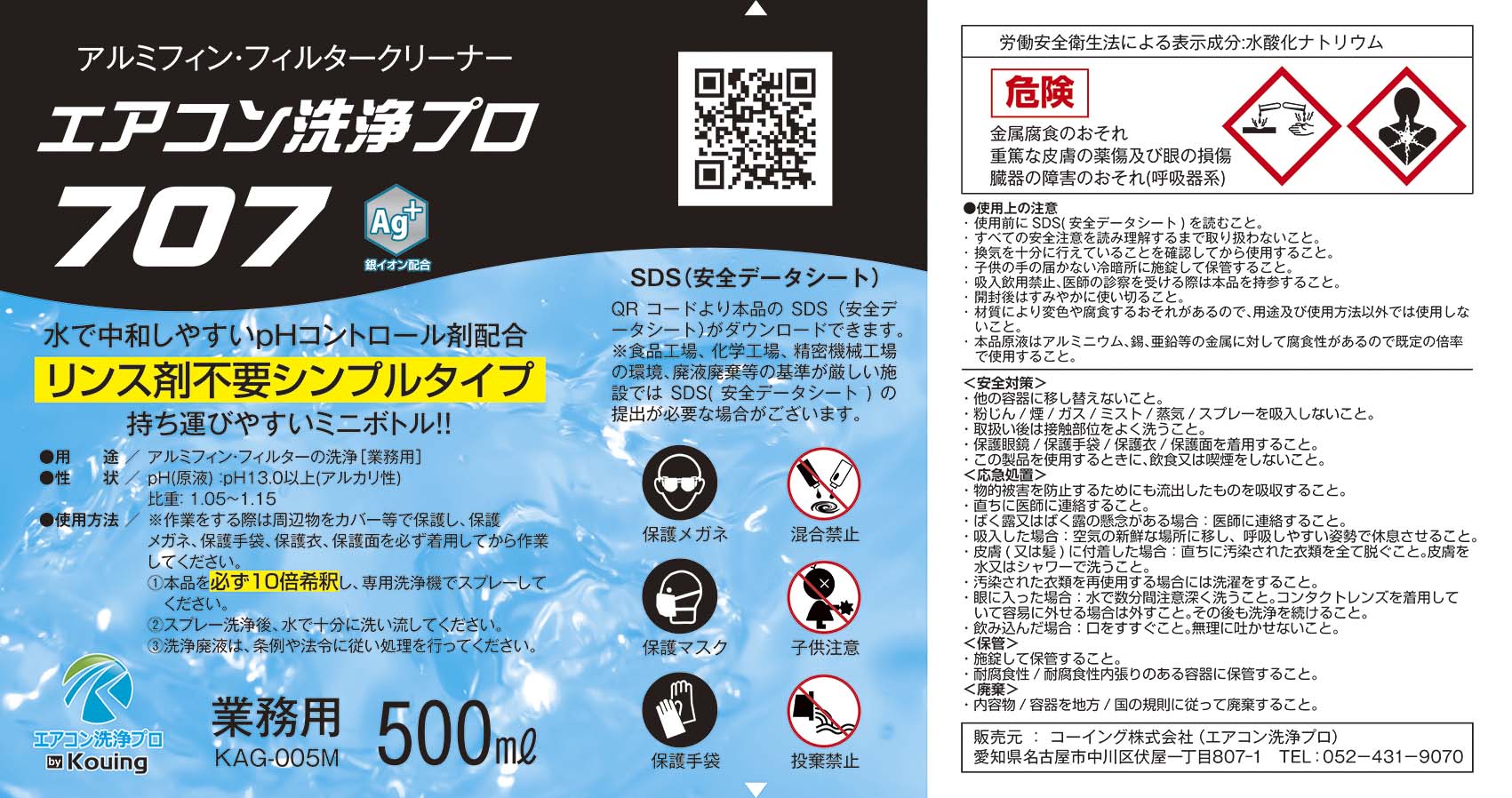 ■エアコン洗浄プロ707 ( 500ml ) ・用途:アルミフィンの洗浄:エアコン室内機・室外機のアルミフィン、フィルター、送風ファン、ルーバー、本体カバーの洗浄 ・特徴:リンス剤不要のシンプルタイプで持ち運びに便利です ・性状:アルカリ性の液体 :/pH(原液):13.0以上 比重:1.05〜1.15 ・荷姿:500ml容器ミニボトルタイプ ・使用目安:家庭用ルームエアコン 2〜5台 ・使用濃度:10倍希釈 (1リットルの洗浄液を作る場合、水900mlに対し100ml) ■壁掛用 エアコン洗浄カバー KB-8016 ・装着部胴回り2400mm(伸縮ゴム付) ・エアコン幅900mmまで対応 ・材質 PEフィルム(t=0.08mm) ・1.6m排水チューブ付 PEフィルム(t=0.08mm) ◆エアコン洗浄プロ707(KAG-005M)の特徴 〇リンス剤不要(pHコントロール剤配合) 〇すすぎ水でpH低下を促進し、作業時間の短縮と洗浄廃液の排出を減量します 〇銀イオン配合による抗菌効果 〇計量カップなしに容量がわかりやすい目盛り付ボトル 〇場所を取らず使い切りやすいミニボトルを採用 〇低泡性で洗い流しやすい ◎しつこい汚れや大量台数を洗浄する業者様には洗浄力特化の エアコン洗浄プロ505・ リンス剤エアコン洗浄プロ404がオススメ! 油でギトギトの換気扇もすっきり洗浄することができます ◆エアコン洗浄プロ707(KAG-005M)使用方法 (1)作業する前に周辺や洗浄部位以外をカバー等で保護し、使用する際には手袋やマスクなどの保護具を着用してください (2)10倍希釈した本品を洗浄部位にスプレーし、5分前後放置してください (3)高圧洗浄機等ですすぎ残しが無いよう十分に水洗いしてください (4)洗浄後に発生した廃液についてはお住まいの条例や法令に従い処理を行ってください ▼注意! エアコン洗浄プロ707(KAG-005M)使用上の注意 ▼弊社取扱いのエアコン洗浄剤関連は通常エアコン洗浄業者が使用するプロ向け業務用仕様です。 商品記載の使用上の注意や説明をよく読んで使用してください。 必ず10倍希釈で取り扱いには十分注意してください。 10倍以上で希釈してしまうと、中和が促進してしまい、洗浄能力が落ちてしまいます。 (10倍希釈の方法については画像をご覧ください) 開封後は長期の保存は避けて、すみやかに使い切ってください。 洗浄剤を廃棄する場合は中和後に地方/国の規則に従い適切な処分を行ってください。 *SDS(安全データシート)について 食品工場、科学工場 精密機械工場等の廃液廃棄等の基準が厳しい施設では SDS(安全データシート)の提出が必要な場合がございます。 弊社ホームページにてダウンロードできます。 お買い得セット 防カビ・防菌JETスプレー 洗浄ノズルガンキット 洗浄カバー 大容量洗浄剤・リンス剤 その他アクセサリ エアコン洗浄プロは30年間エアコン洗浄専門業者として培った経験を活かし、 エアコン洗浄業者様向けに現場で実際に使用した確かな実績のある商品をご用意しております。 エアコン洗浄カバー、業務用 エアコン洗浄剤、リンス剤、 高圧洗浄機(ケルヒャー、アイリスオーヤマ、ハイコーキ、マキタ<makita>、マルヤマ<丸山製作所>、キョーワ) 及び洗浄ノズル、高圧ホースそして洗浄後に使う防カビ抗菌コーティングスプレー等、幅広く取り揃えております。 エアコン洗浄シートは、国内メーカーの高品質PEフィルムを使用し国内製造の日本製となっております。 掃除シート用(洗浄カバー)に使用しているゴムは、特注の生ゴムを使用しており伸縮性が高くエアコンにフィットしやすくなっております。 また、天カセ(天井カセット)・天吊りエアコン、家庭用エアコン(ルームエアコン)を洗浄されている業者様向けに、 大容量のアルミフィンクリーナー、リンス剤、スライム抑制剤、十川製の高圧ホース及び巻取機(ホースリール)も販売しております。 都市部の業者様のご要望により入手性や可搬性を重視した、大手メーカー製の高圧洗浄機と互換性のあるエアコン洗浄用ノズルもご用意しております。 ※注意!高圧洗浄機に標準で付属している高圧ホースには接続できません(ねじ規格G1/4) ワンタッチカプラー、ハイタッチコック、など細かなアクセサリ道具もご用意しておりますので、洗浄用品一式がセットで揃えることができます。 エアコン洗浄にはリスクが伴うため、自己の責任において作業が困難な場合は、ご自分で行わずに専門業者にご依頼いただくことをお勧めいたします。■洗浄カバーKB-8016の特徴 〇ディスポーザブルタイプのエアコン洗浄カバーでは、唯一の30年以上前から国内メーカーの材料を使用し国内で製造している純日本製エアコン洗浄カバーです。 〇国内メーカー製の高品質ゴムを使用し洗浄カバーの使用時、高い伸縮性と取り付けやすさを実現。 取り外す際もゴムが縮むため廃液の漏出を抑えられます。 〇試作時より、ゴワゴワしない作業しやすい最適な厚さを検証し、0.08mmの国内大手メーカーの PEフィルムを使用して製造しております。 〇日本国内で製造されているため、「化学物質の審査及び製造等の規制に関する法律」に準じ、 また材料生産時