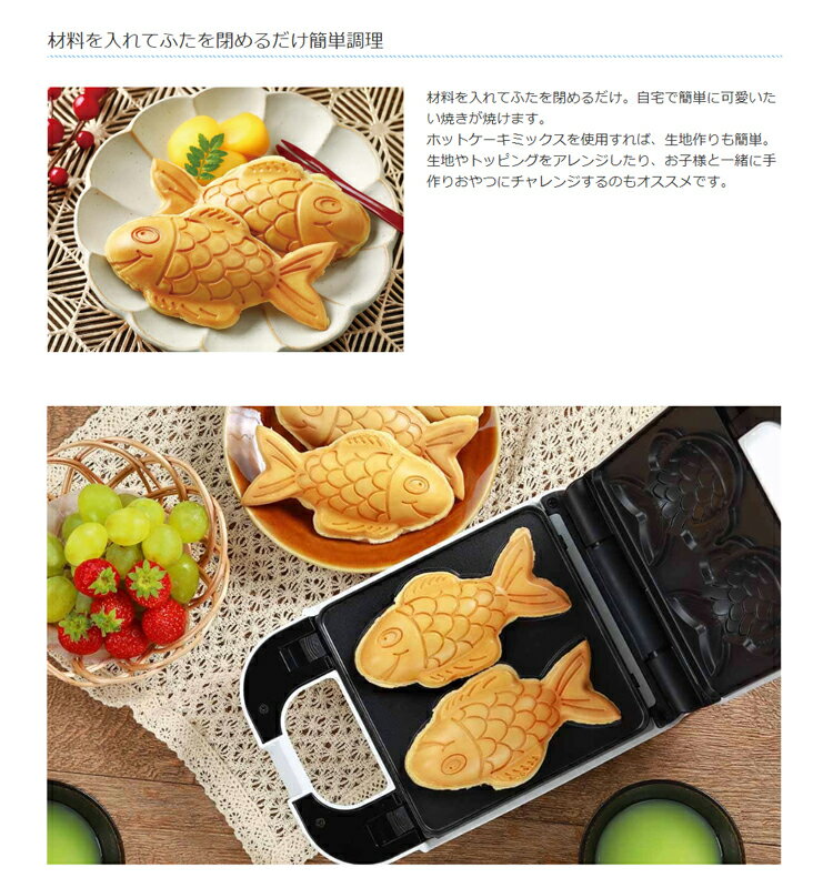 ライソン ホットサンドメーカーと たい焼きプレートセット 仕様 定格電圧:AC100V 定格周波数:50/60Hz 消費電力:650W 温度ヒューズ:240℃ サイズ:約W15×D24×H11cm 重量:約1.2kg 電源コード:約0.9m 【セット内容】 本体、ホットサンドプレート、たい焼きプレート 【材質】 本体:フェノール樹脂、 プレート:アルミニウム(フッ素樹脂加工)ホットサンドメーカーと たい焼きプレートセット ホットサンドメーカーとたい焼きプレートセット ホットサンドメーカーとたい焼きが作れるセットです!! プレートは着脱式ですので、お手入れも簡単です!! こちらのページはメーカーたい焼きメーカー生産終了のためたい焼きメーカーのページを変更しております。 機械自体は同じ物になりますので御理解くださいます様御願い致します。 ホットサンドはパンと食材を挟んでフタを閉めるだけ お好みの食材をパンにのせてフタを閉めるだけ。 約3分でサクッと香ばしいホットサンドが焼きあがります。 耳付き食パンを使えるので、耳を切り落とす手間もありません。 ※ホットサンドが焼き上がる目安時間は約3分ですが、焼き足りない場合は時間を延長し、お好みで調節してください。 たい焼きも材料を入れてふたを閉めるだけ簡単調理 材料を入れてふたを閉めるだけ。自宅で簡単に可愛いたい焼きが焼けます。 ホットケーキミックスを使用すれば、生地作りも簡単。 生地やトッピングをアレンジしたり、お子様と一緒に手作りおやつにチャレンジするのもオススメです。 ホットサンドの作り方 1.本体にパンをのせる。 2.具材をのせる。 3.パンをのせる。 4.フタを閉めて約3分待つ。 5.できあがり。 お好みでカットしてお召し上がりください。 たい焼きの作り方 1.本体に生地をのせる。 2.あんこをのせる。 3.生地をのせる。 4.フタを閉めて約3分待つ。 5.できあがり。 ※焼き時間の目安は約3分ですが、焼き足りない場合はお好みで焼き時間を調節してください。 ホットサンドは深さ約1.5cmのプレート プレートの深さが約1.5cmあるから、6枚切りの耳付きパンやマフィンも焼けます。 たっぷり具材を挟んで、ボリューム満点の厚焼きホットサンドが作れます。 ホットサンドアレンジ 色々な食材で食事にもスイーツにも アレンジいろいろ。 買ってきたお惣菜や昨日の夕飯の残り物を入れれば、朝食用のおかずパンに。 フルーツや板チョコを挟めばカフェのようなスイーツに。 パイ生地やご飯を挟んでも◎ たい焼きアレンジ 切りもちやパイ生地を生地にしたり、お好みのフィリング(具)に変えたり。 スイーツから軽食まで色々なアレンジを楽しめます。 具なしのたい焼きを半分にスライスして、お好きな具材を挟めばたい焼きサンドに。 かわいい見た目と美味しさで、ホームパーティーにもぴったりです。 フッ素樹脂加工&着脱式プレート フッ素樹脂加工で焦げ付きにくくなっています。 油をひかずに調理できるのでノンオイルでヘルシー。 着脱式プレートなので、水洗いできてお手入れ簡単です。 電源コードすっきり 本体の裏面にコードが巻けるので、スッキリ収納できます。 縦置きコンパクト収納 立てて収納できるので、狭いキッチンでも置く場所に困りません。 サッと取り出して手軽に使えます。