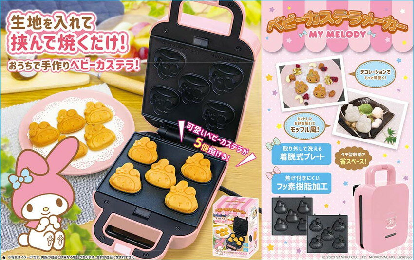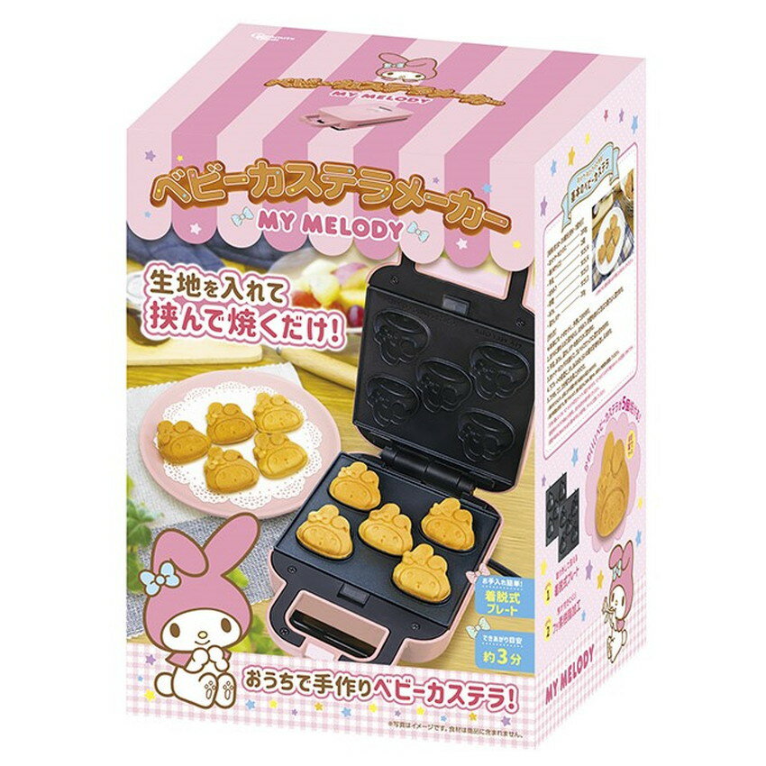 マイメロディ ベビーカステラメーカー 仕様 メーカー:ピーナッツクラブ 種類:マイメロディ 型番:SL05SR-003MM 本体サイズ:約H21×W13.3×D9.5cm(コード除く) パッケージサイズ:約H24.2×W16.9×D13.4cm 材質:本体:フェノール樹脂 :プレート:アルミニュウム(フッ素樹脂加工) 重量:約1010g(本体約850g、プレート約160g) 電源:家庭用100V電源使用 定格電圧:AC100V 消費電力:最大520W 温度ヒューズ:240° コード長さ:0.9m 定格周波数:50/60Hz 対象年齢:12歳以上 ご注意 ※やけどの恐れがあるためお子様のみでのご使用はお控えください。マイメロディ ベビーカステラメーカー とっても可愛いマイメロディのカステラが、1度に5個作れるよ! 生地を型に流し込んだら2~3分待つだけ! ホットケーキミックスで簡単調理!!! 約3分で焼きあがる 焼き上がり時間たったの約3分。 スピーディーに可愛いマイメロディーのカステラが完成します。 急な来客のおやつ、お子さまのお誕生日会やホームパーティーにもおすすめです。 ※ベビーカステラが焼き上がる目安時間は約3分ですが焼き具合を確かめ、焼き足りない場合は時間を延長し、お好みで調節してください。 ベビーカステラの作り方 1.電源を入れて予熱したプレートに生地を流し込みます 2.蓋を閉めて約3分待ちます 3.好みの焼き加減まで焼けたら完成です デコレーションでもっと可愛く! カットしたお餅を焼いてモッフル風! プレートが取り外して洗えるため、お手入れカンタン 焦げ付きにくいフッ素樹脂加工のプレート タテ型収納で、省スペース! パッケージもコンパクト お子様といっしょに楽しくおやつ作り。 大人も思わずほほ笑んでしまう、可愛らしいベビーカステラ。 お祭り気分で、ご自宅でカンタンにお楽しみいただけます! 別売りプレートで他のキャラクターも作れます!!