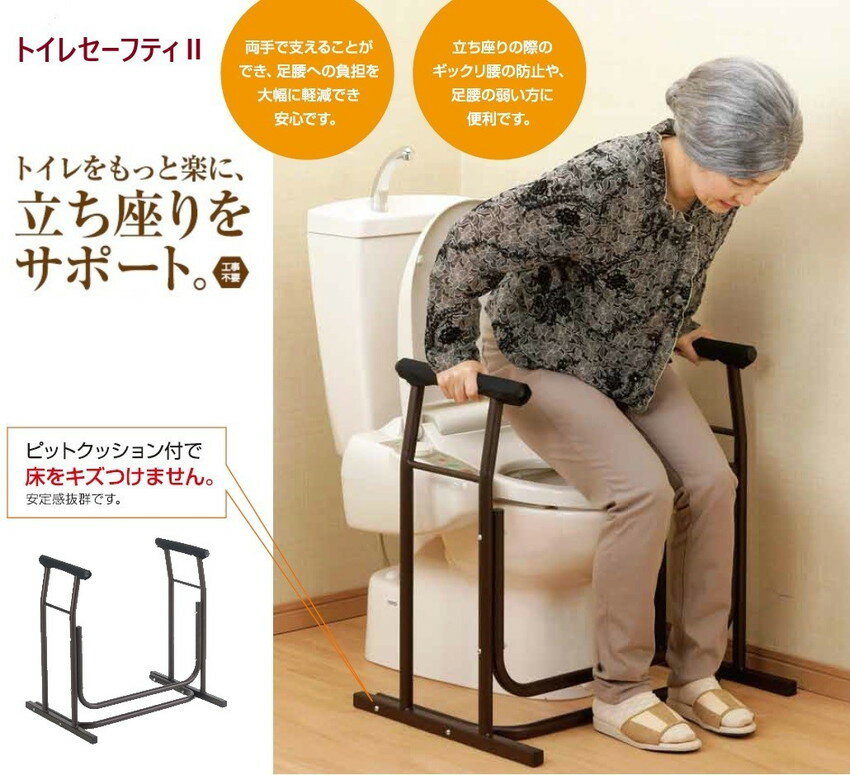 トイレセーフティII 仕様 メーカー:カクセー 商品名:トイレセーフティロールII ご使用可能体重:75kg以下 組み立て後サイズ:約490×660×645mm 商品重量:約4.7kg 材質: 本体:鉄パイプ(粉体塗装) 持ち手:ポリエステル・EVA ピットクッション:ウレタン樹脂 パッケージサイズ:約505×670×110mm パッケージ込み重量:約5kg 原産国:中国 JANコード:4972940729982 備考 ※この商品は組み立て式です。 ※ドライバー等は付属しませんので、ご用意ください。トイレセーフティII 立ち座りをサポートするトイレ用手すり トイレでの足腰の負担を減らす! しっかり足腰をサポート! 立ったり座ったりをもっと楽に! トイレでシニアを助けるセーフティーロール。 ピットクッション付きで安定感バツグン。 床も傷つけません。 トイレをもっと楽に。 トイレで用を足すときに、腰かけたり、立ち上がったりする動作。 お年寄りやギックリ腰・足腰の弱い方にはキツい動作です。 そんな方にあると助かるのが本商品。 本体には粉体塗装が施され、傷つきにくくなっております。 組み立て式手すり 工事は一切不要で、ほとんどの洋式トイレに設置できます。 両手で支えることが出来るので、足腰への負担を大幅に軽減でき安心です。 十分なスペースがあり、シャワートイレにも対応します。 ※組み立て後のサイズをご確認後、ご購入下さい。