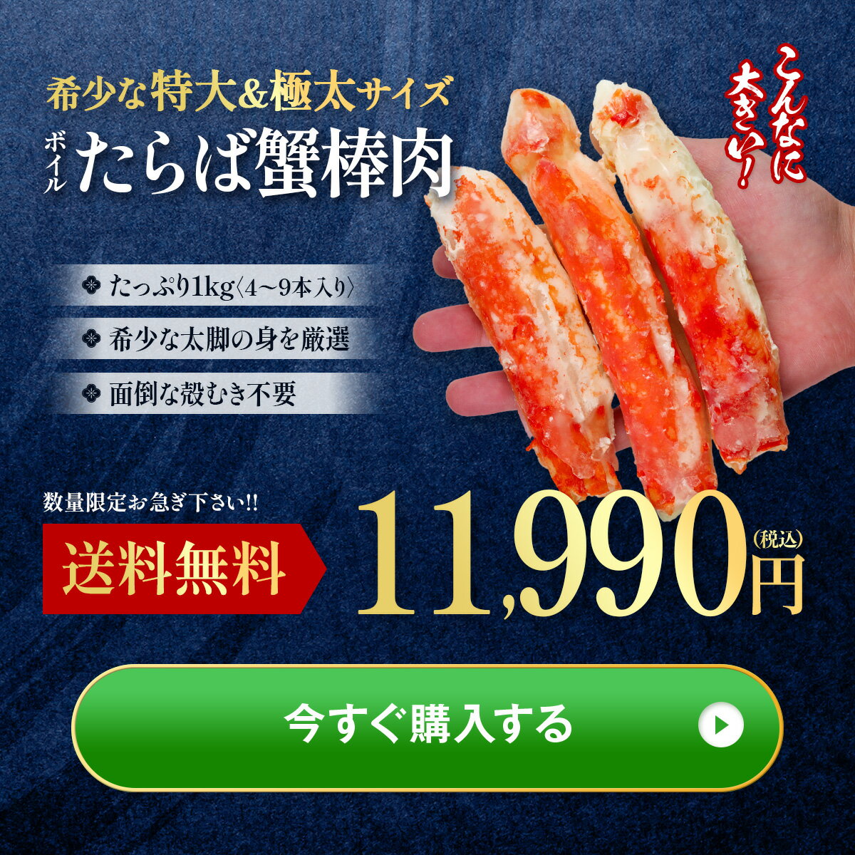 商品のポイント この商品のポイントは… ◎極寒の海で水揚げされる身入りの良いタラバガニを厳選! ◎希少な特大&極太サイズだから食べ応え抜群! ◎面倒な殻むき不要!殻をむいて棒肉の状態でお届け! ◎ボイル済みなので自然解凍でそのまま食べられます! ◎バター焼きや天婦羅など、いろんな食べ方でお楽しみ下さい! ◎数量限定で半額クーポン開催!(2025/1/31まで予定数量に達するまで繰り返し半額クーポン発行) タラバガニの魅力はなんといっても、ズワイガニや毛ガニとは比べものにならない足の太さです。極寒の海で水揚げされた身入りの良いタラバガニを厳選し、船上で活〆ボイルし美味しさそのまま急速凍結した一級品です。今回は特別に太脚のみを厳選し、食べやすく殻をむいてお届け!自然解凍するだけでそのままお召し上がりいただけますが、個人的にお勧めなのが、バター焼き。ホットプレートやフライパンでサッと炙ると、その香ばしさが身にささり、グッと甘みが倍増します。大きさといい、味といいタラバガニの魅力を存分に楽しめる逸品です。ご贈答やお友達との忘年会や新年会、そしてご家族の集まりに是非このタラバガニをお試しください! 商品内容 ボイルたらばがに足むき身:1kg(解凍後800g)4~9本入り 原材料:タラバガニ ロシア産のタラバガニをベトナムの工場で殻むき作業をしています。 賞味期限 ご家庭用の冷凍庫の場合、ドアの開閉が多く品質劣化する場合がありますので、1カ月以内を推奨しています。 解凍後は冷蔵保存にて当日中にお召し上がりください。 お召し上がり方 ≪解凍方法≫ 食べる分だけ冷凍庫から出してボールに入れます。直接、流水をあてて、カニ表面の氷の膜を洗い落してください。カニの芯は凍っていてOKです。表面の氷の膜がとけたらキッチンペーパーで水気を取り、お皿の上にのせて1時間ほどで解凍してください。 ※水の中で完全解凍すると、カニの旨みが抜けて水っぽくなるのでご注意下さい。 ≪お召し上がり方≫ 絶妙の塩加減でボイルしてありますので、まずはそのままお召し上がりください。お好みで三杯酢やポン酢を付けても美味しいです。 配送について 注文より4日後以降〜30日以内でご指定下さい。 即日配送のあす楽にも対応しています。※天候・交通等の影響により、ご指定日時にお届けできない場合もございます。→ 配送の遅延について 販売者 株式会社伝食 〒914-0811 福井県敦賀市中央町2-22-32ダイヤモンド・プラチナ会員様限定★2,000円OFFクーポンで11,980円⇒送料無料9,980円!