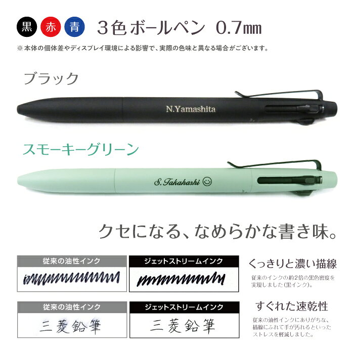 父の日・母の日・敬老の日、就職祝、進学祝などプレゼントやギフトにぴったり★ ビジネスにもプライベートにもベストな3色ボールペン お名前を刻印するので、置き忘れたり貸したりしても手元に戻ってきやすい 性別年齢を選ばないシンプルなデザインに加え、ラッピングしてお送りしますので贈り物にも最適です ◆ボール径:0.7mm ◆インク色:3色(黒・赤・青)、替芯:SXR-200-07 ◆機構:ノック式 ◆軸仕上げ:(先軸)真鍮+塗装/(中軸)ステンレス+塗装/(後軸)ABS樹脂+塗装/(クリップ)鋼材+塗装 ◆サイズ:軸径Φ11.0×厚さ16.5×全長143.4mm ◆重量:27.0g ◆本体カラー:ブラック、スモーキーグリーン から選べます ◆名入れ書体:ゴシック体、明朝体、筆記体※英数字のみ から選べます ◆ラッピング:専用包装紙でラッピングをいたします ※ラッピングがご不要の場合は、お知らせください ◆配送方法:ネコポス(送料無料) ◆重要◆ご購入ボタン付近の「刻印内容欄」に刻印するお名前をお入れ下さい(ローマ字=18文字まで、日本語=12文字まで。空白(スペース)、記号(.!?&)も1文字に含まれます) ※複雑な漢字、字画の多い感じは文字がつぶれる可能性がございます ※名入れ商品は受注生産品のため、返品・交換はできません。ご確認のうえ、お買い求め下さい。※◆こちらもオススメ!◆ 黒・赤・青 3色ボールペン (0.5mm)はこちら(リンク先) 黒・赤 2色ボールペン + シャープペンタイプはこちら(リンク先)