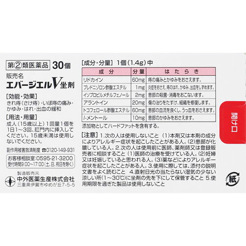 エバージエルV坐剤 きれ痔(さけ痔)・いぼ痔の痛み・かゆみ・はれ・出血の緩和。 ●痔疾患は、静脈のうっ血が原因となって、炎症、痛み、かゆみ、出血を引き起こします。さらに肛門部の抵抗力が低下すると、腸内細菌や化膿菌等の感染によって症状が悪化して、複雑な痔となってしまいます。このような痔疾患の治療には、まず局所の炎症を鎮め、痛みや出血の原因を早めに正しい方法で取り去ることが大切です。 ●エバージエルV坐剤は、痔に効果のある薬剤を肛門内のどの患部へも的確に届けることができるので、激しい痔の痛み・かゆみ・出血等の諸症状にも、より確実に、優れた効果をあらわします。 使用上の注意 ■してはいけないこと (守らないと現在の症状が悪化したり,副作用・事故が起こりやすくなる) 1.次の人は使用しないこと (1)本剤又は本剤の成分によりアレルギー症状を起こしたことがある人。 (2)患部が化膿している人。 2.長期連用しないこと ■相談すること 1.次の人は使用前に医師,薬剤師又は登録販売者に相談すること (1)医師の治療を受けている人。 (2)妊婦又は妊娠していると思われる人。 (3)薬などによりアレルギー症状を起こしたことがある人。 2.使用後,次の症状があらわれた場合は副作用の可能性があるので,直ちに使用を中止し,この文書を持って医師,薬剤師又は登録販売者に相談すること [関係部位:症状] 皮膚:発疹・発赤,かゆみ,はれ その他:刺激感,化膿 まれに次の重篤な症状が起こることがあります。その場合は直ちに医師の診療を受けること。 [症状の名称:症状] ショック(アナフィラキシー):使用後すぐに,皮膚のかゆみ,じんましん,声のかすれ,くしゃみ,のどのかゆみ,息苦しさ,動悸,意識の混濁等があらわれる。 3.10日間位使用しても症状がよくならない場合は使用を中止し,この文書を持って医師,薬剤師又は登録販売者に相談すること 効能・効果 きれ痔(さけ痔)・いぼ痔の痛み・かゆみ・はれ・出血の緩和 用法・用量 次の量を肛門内に挿入してください。 年齢・・・1回量・・・1日使用回数 成人(15歳以上)・・・1個・・・1〜3回 15歳未満・・・使用しない 用法関連注意 (1)用法・用量を厳守すること。 (2)本剤が軟らかい場合には,しばらく冷やした後に使用すること。また,硬すぎる場合には,軟らかくなった後に使用すること。 (3)肛門にのみ使用すること。 成分・分量 1個(1.4g)中 成分・・・分量・・・作用 リドカイン・・・60mg・・・痔の痛みとかゆみをおさえます。 プレドニゾロン酢酸エステル・・・1mg・・・炎症をおさえ、痔のはれ、かゆみ、出血をしずめます。 イソプロピルメチルフェノール・・・2mg・・・患部の殺菌・消毒をおこないます。 アラントイン・・・20mg・・・傷の治りをたすけ、組織を修復します。 トコフェロール酢酸エステル・・・60mg・・・患部の血流を良くし、うっ血をおさえます。 l-メントール・・・10mg・・・患部のかゆみをおさえます。 添加物としてハードファットを含有する。 保管及び取扱上の注意 (1)直射日光の当たらない湿気の少ない涼しい所(1〜30℃)に保管すること。 (2)小児の手の届かない所に保管すること。 (3)他の容器に入れ替えないこと(誤用の原因になったり品質が変わる。)。 (4)坐剤の先端を下向きにして保管すること(軟化しても坐剤の変形を防ぐことができる。)。 (5)使用期限を過ぎた製品は使用しないこと。また開封後は使用期限内であってもなるべく速やかに使用すること。 発売元 中外医薬生産株式会社 問い合わせ先:お客様相談室 電話:0595-21-3200 受付時間:9:00〜17:00(土・日・祝日を除く) 区分 第(2)類医薬品/日本製 広告文責:ヘルスケアコヤマ 029-302-2920※リニューアル、発売終了などの場合が ございます。予めご了承くださいませ。
