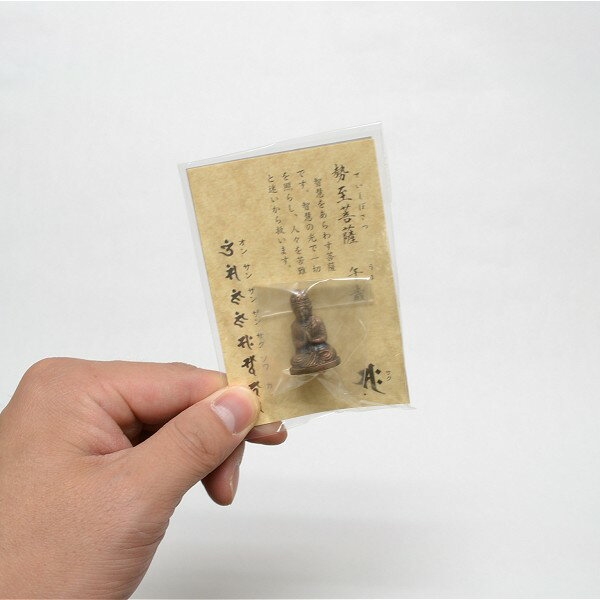 商品情報説明智慧の光で迷いを照らす「勢至菩薩」のミニ仏像 - あなたの心に、叡智の輝きを仏教の世界観の中で、智慧を象徴する存在といえば勢至菩薩です。その名は「智慧を得て、大いなる勢力を持つ者」を意味するとされ、釈尊の脇侍の一人として知られています。勢至菩薩は、その智慧の光で一切の闇を照らし、人々の苦しみと迷いを払うと言われています。無明に覆われたこの世界にあって、勢至菩薩の放つ光明は、まさに希望の象徴。心の中に灯った智慧の輝きによって、私たちは真実の道を歩むことができるのです。特に午年生まれの人にとって、勢至菩薩は守護仏としてお馴染みの存在です。生年の干支に対応した仏様を身近に感じることは、人生の羅針盤を手に入れるようなもの。いつも勢至菩薩の智慧が導いてくれると信じることで、迷いのない一年を過ごせるはずです。そんな勢至菩薩の御姿を、小さなサイズで表現したのがこのミニ仏像です。穏やかな微笑を浮かべ、智慧を象徴する印相を結ぶ姿は、どこか慈悲深さも感じさせます。手のひらサイズの像の中に、勢至菩薩の悟りの世界が凝縮されているかのようです。このミニ仏像を、あなたの心の拠り所としてみませんか。机の上に置いて瞑想の対象とするもよし、お守りとして持ち歩くもよし。智慧と救済の象徴である勢至菩薩を身近に感じることで、迷いに悩むことがなくなるはずです。苦難の多いこの世を生きるうえで、心の支えとなるものがほしい。そんな現代人の願いに、勢至菩薩のミニ仏像は見事に応えてくれます。小さな像の中に秘められた、計り知れない叡智の力。それを感じられる時間を、ぜひ日常の中に作ってみてください。ミニ仏像 - 忙しい日常に、安らぎの一瞬をわずか3〜4cm前後の小さなサイズながら、この仏像は本格的な造りで仏像工房にて丁寧に作られています。手のひらに収まるコンパクトさでありながら、信仰の対象としても十分な存在感を放っています。日々の喧騒の中で、ふとした瞬間にこのミニ仏像を手に取ってみてください。小さな仏様の姿に心を寄せれば、穏やかな安らぎが全身を包み込むでしょう。お守りとして身につけたり、デスクの片隅や玄関先に飾ったりと、さまざまな場所に置いて楽しむことができます。いつでも身近に感じられる存在だからこそ、あなたの心に平安をもたらしてくれるのです。この商品は美術品として販売されており、開眼供養などの特別なご祈祷は行われておりません。しかし、その小さな姿には、仏様の慈しみと魂が宿っています。忙しい現代社会を生きるあなたに、ほんの一瞬でも心の安らぎを与えてくれる、そんな特別な存在になってくれることでしょう。※この商品は美術品として販売しておりますので開眼供養など特別なご祈祷は行っておりません。規格サイズ:3〜4cm銅製ギフト対応非対応包装は、非対応のし紙は、非対応発送に関することこの商品はメール便(送料無料)で発送することができます。その場合は発送方法は『メール便』をお選び下さい。