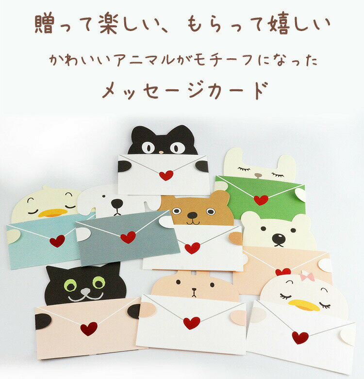 贈って楽しい、もらって嬉しい かわいいアニマルがモチーフになったメッセージカード。 9種類のアニマルデザインのメッセージカードが各1枚ずつ入った9枚セット。 封筒を大切に抱える動物たちの可愛らしいデザインが デスクや書棚を彩るペーパースタンドとして置いて飾ることもできるので、 大切な想いやメッセージがいつもいつまでも伝えられます。 母の日や父の日、誕生日、バレンタインデーやクリスマスなどマルチに使えるデザインです。 商品サイズ:画像参照 個数:9枚(各1枚ずつ) 製造国:中国 ※お使いのモニターや環境により、若干色味が異なって見える場合があります。 ※仕様は改善の為に予告なく変更する場合があります。 ※こちらの商品はメール便発送にて送料無料です。 ※メール便での発送は(ポスト投函)代金引換、日付指定はできませんのでご了承ください。
