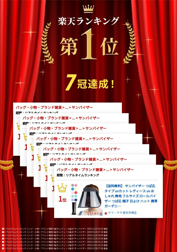 【商品名】サンバイザー つば広タイプ uvカット レディース uv おしゃれ 無地 フルサイズ ロールバイザー つば広 帽子 日よけ ハット 携帯 ガーデニング 黒 テニス 紫外線対策 日焼け止め 【商品説明】360度角度調節ができるサンバイザーハット。夏の紫外線対策としてスポーツ観戦やレジャーはもちろん、自転車にて外出時やガーデニングなどの日差しを浴びるシーンには必須の定番アイテムです。 くるくると丸めて収納可能なサンバイザーなのでカバンにコンパクトに収納でき持ち運びに便利です。また、取り外し可能なヒモも付属されているので落下防止や首掛けストラップなどにも。 サンバイザー部分のカラーがほどよい色合いなので、真っ黒なサンバイザーと比較して日陰などで視界が悪くなったり、実際の色と全然違って見えるというストレスもありません。 お手頃価格なので、男性女性・男の子女の子問わずプレゼントにもオススメのサンバイザーハットです! ■サイズ:フリーサイズ(※表記寸法と実寸値の多少の誤差はご了承ください。) ■重さ:約130g ■素材:コットン、ポリカーボネート ■カラー:全11色 ■中国製 【発送とご注文について】サンバイザー(日よけ帽子)は数量に限りがございますので、今スグのご注文がオススメです。 【商品のコンディション】新品のサンバイザー(日よけ帽子)で、コンディションは良好です。※写真はできるだけ実物に近い色を表現できるよう努めておりますが、ご利用のPCやスマホなど表示機器の都合上、若干の差異が生じますことをあらかじめご了承ください。フルサイズ『つば広UVカットサンバイザー』サンバイザー全5色:cap-253 360度角度調節ができるサンバイザーハット。夏の紫外線対策としてスポーツ観戦やレジャーはもちろん、自転車にて外出時やガーデニングなどの日差しを浴びるシーンには必須の定番アイテムです。 ■UVカット対応のサンバイザーハット サンバイザー部分のカラーがほどよい色合いなので、真っ黒なサンバイザーと比較して日陰などで視界が悪くなったり、実際の色と全然違って見えるというストレスもありません。 ■サンバイザーハットはプレゼントにもオススメ お手頃価格なので、男性女性・男の子女の子問わずプレゼントにもオススメのサンバイザーハットです! ご購入前にお読みください タイプ つば広UVサンバイザー サイズ フリーサイズ 重さ 約130g 素材 コットン、ポリカーボネート カラー 全11色 商品について 360度角度調節ができるサンバイザーハット。夏の紫外線対策としてスポーツ観戦やレジャーはもちろん、自転車にて外出時やガーデニングなどの日差しを浴びるシーンには必須の定番アイテムです。 くるくると丸めて収納可能なサンバイザーなのでカバンにコンパクトに収納でき持ち運びに便利です。また、取り外し可能なヒモも付属されているので落下防止や首掛けストラップなどにも。 サンバイザー部分のカラーがほどよい色合いなので、真っ黒なサンバイザーと比較して日陰などで視界が悪くなったり、実際の色と全然違って見えるというストレスもありません。 お手頃価格なので、男性女性・男の子女の子問わずプレゼントにもオススメのサンバイザーハットです! 注意点 写真はできるだけ実物に近い色を表現できるよう努めておりますが、ご利用のPCやスマホなど表示機器の都合上、若干の差異が生じますことをあらかじめご了承ください。 ※入荷時期によりデザインや仕様、色味などが異なる場合があります。 ■本製品を使用して発生した事故・トラブル・破損等につきましては一切の責任を負いかねます。
