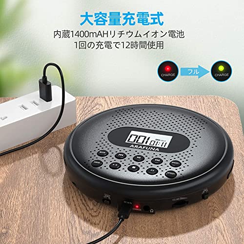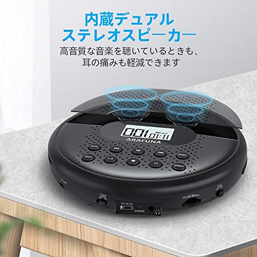 ◆商品名:ポータブルCDプレーヤー コンパクトCDプレーヤー ARAFUNA スピーカー内蔵式CDプレーヤー 1400mAh充電式バッテリー CDウォークマン スピード調整可能 ABリピート機能 レジューム機能 音飛び防止機能 5EQモード 32GB Micro SDカード 語学学習 音楽再生 出産前教育 日本語取扱書付き [ブラック ] (1)【スピーカー内蔵式CDプレーヤー】cd プレイヤーはスピーカーが2つ搭載されて、高い音楽を楽しめる.スピーカーが付いているので、イヤホンが必要ないです.耳が疲れて痛くなることも有りない.軽量コンパクトでCDプレーヤーとは、外出にも持ち運びに便利です。また、ワイヤー制御のイヤホンは付属しているため、周囲に迷惑をかけずにロスレス音楽を楽しめることは便利です。 (2)【1400mAhの大容量充電式 cdプレーヤー】ポータブルCDプレーヤー は1400mAhの大容量電池を内蔵されており、付属のUSB充電ケ ーブルで約4時間で完全に充電することが可能で、中音量で音楽を再生する と12時間以上使用できます。充電池とAC電源に対応した2電源タイプで、付属のUSB充電ケーブルでPC、パソコン、バッテリーに接続して使 用できて、いつでもどこでも楽々とCDプレーヤーを使用できます。 (3)【小型CDプレーヤー&多機能】 ARAFUNA CDプレーヤーは、さまざまな最新機能を備えています。例えば (1)スピード調整機能。ESP機能:音飛び防止機能(2)5種類のEQエフェクト機能:BBS、ポップ、ジャズ、ロック、クラシック、(3)4種類のプレイモード: 1曲再生・全曲リピート再生・順番再生・ランダム再生、INTRO再生(4)キーロック(ホールド機能)、(5)聴きたい部分を繰り返して再生できる「A-Bリピート機能」、(6)AUX入力/出力. (4)【幅広い互換性&AUX入力/出力】このCDプレーヤーは、CD、CD-R、HDCD、MP3ディスク、CDのWMAオーディオファイル、MicroSDカードファイルなど、さまざまなオーディオフォーマットに対応するできます。「※注意:32GB Micro SDカードサポートのみ対応できていて、SDカードに対応不可」. AUXケープルで3.5ミリのオーディオ入力により、外部デバイスを接続して再生できます。自宅や通勤・通学時など使用場所を選ばずに活躍します。語学学習にも役立つポータブルCDプレーヤーです。 (5)【付属品と安心保証】パッケージ内容: CDプレーヤー本体x1台、3.5〜3.5mm AUXケーブルx1本、有線イヤホンx 1個、USB充電ケーブルx 1本、取扱説明書x 1冊、クイックスタートガイドx 1 枚。▲注意点:(1)液晶画面を保護するため、液晶画面にPEフイルムを貼ってから出荷します。液晶画面の擦り傷がある場合は、画面の傷ではなくて、PEフイルムの傷である可能性があります。気になるお客様は、フィルムを外してから使用ください。