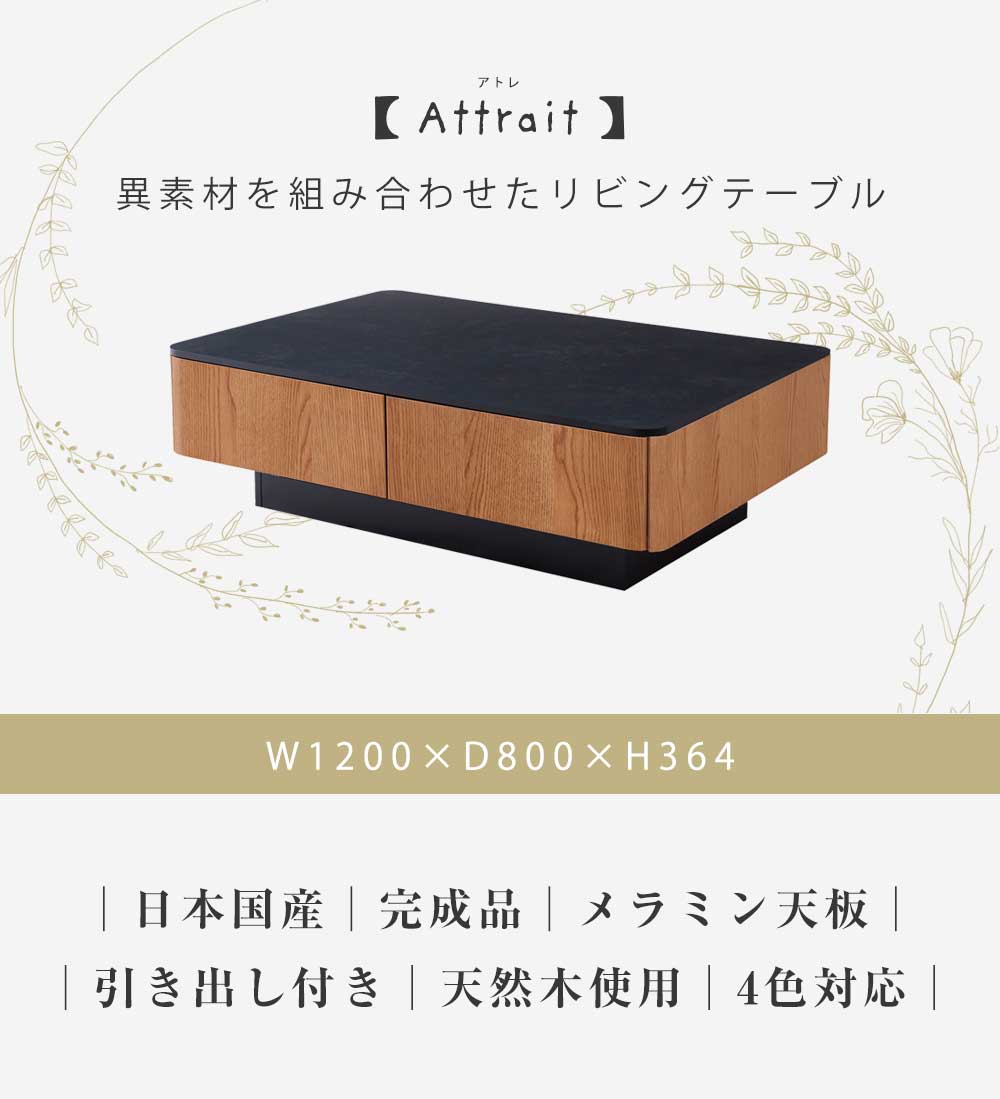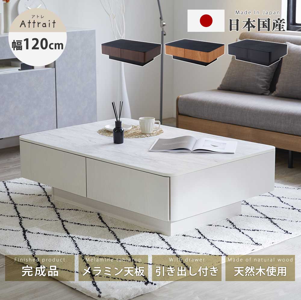 【10%OFFクーポン】リビングテーブル 国産 モーブル おしゃれ 北欧 白 120幅 正方形 4人用 収納 引き出し付き アトレ センターテーブル ローテーブル テーブル モダン 天然木 木製 木 メラミン天板 ブラック ブラウン 北欧風 ワンルーム