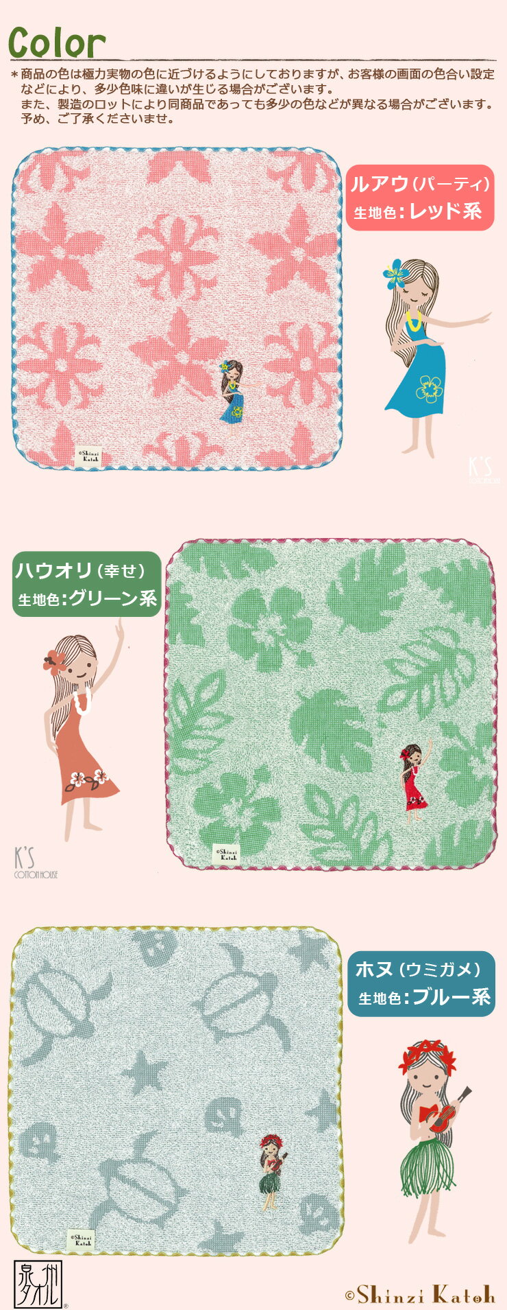 ▼ 配送情報 ▼関連商品 ▼商品情報 商品名 【ShinziKatoh】『フリフリ』タオルハンカチ 約23×23cm 商品詳細 大人気のフラガールシリーズに、ジャガード柄と刺繍のデザインが登場♪ ■手触りの楽しい凹凸タオル ジャガード織りにすることで、タオルに「モチーフ」を凹凸柄で表現しています。 糸を甘く撚った「甘撚りパイル」で柔らかさを楽しみながら、タオルのくぼんだ部分も感じられます。 ■柄は全部で3種類 『ルアウ(パーティ)』『ハウオリ(幸せ)』『ホヌ(ウミガメ)』。 タオル地のモチーフと刺繍のワンポイントがキュートです。 タオル地は、凹凸で植物や海の生き物のシルエットがデザインされおり、 刺繍は、可愛いフラガール達がデザインされています。 ■プレゼントにもピッタリ♪ シンプルで可愛いいデザインは、小さなお子様から幅広い年齢層でお気に召していただけます。 ご自分用はもちろんお友達とおそろいにしたり、プレゼントやお礼にも最適です。 また、カバンやポケットに入れて、日常のポイントにいかがでしょうか。 ■「泉州タオル」の吸水性と使いやすさ 織り上げた後に、糊や不純物を洗い流す泉州タオル伝統の「後ざらし製法」だから、使い始めから「吸水性」抜群。とっても柔らかい独特の「肌触り」も特長です。 すべての工程を把握できる「自社製」だからこそ、自信を持ってご提供できる安心・安全の「日本製」。 サイズ 大きさ:約23×23cm タオルハンカチ 素材 綿100% (スレン糸使用) 生産地 日本製(大阪府泉佐野市) 熟練職人が織り上げた「金野タオル」の泉州タオル 取扱上の注意 ■綿素材のため、お洗濯の際、多少縮みがでる場合があります。 ■すべてのタオルは、使い始めに毛羽落ちがあります。念のために最初の数回のお洗濯は、多めの水でタオルのみでのお洗濯をお願いいたします。 ■商品の色は極力実物の色に近づけるようにしておりますが、お客様の画面の色合い設定などにより、多少色味に違いが生じる場合がございます。 また、製造のロットにより同商品であっても色などが異なる場合がございますので、予めご了承くださいませ。 ※『簡単なケア方法の説明書』をお付けしますので、快適にお使いいただくために、ぜひ事前にお読み下さい。 関連キーワード 発表会 楽器 ハワイ ウクレレ ダンス フラダンス フラ ハイビスカス フラ雑貨 グッズ 南国 保育園 幼稚園 誕生日 記念日 敬老の日 内祝い 贈り物 オススメ お歳暮 お中元 ご挨拶 かわいい 可愛い キュート Shinzi Katoh シンジカトウ ギフト プチギフトプレゼント 退職 転勤 転居 入学 就職 新生活 引っ越し 新築 お返し 泉州タオル 日本製 国産 雑貨 子供 女の子