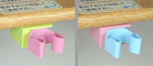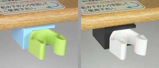 サイズ 縦 75mm × 横 41mm × 高さ 27mm 本体色 ベージュ&ブラウン,グリーン&ピンク,ピンク&ブルー ブルー&グリーン,ブラック&ホワイト 材質 ABS,エラストマー (プラスチック)弊社商品は全て、自社製品、日本製です。 (粘着シール型“杖ホルダー”,ステッキホルダー,傘ホルダー) 杖やすめ かくれんぼ 机の下に粘着シールで取り付け使用時に机の下から出し、使用後は、元の机の下に戻す。通行などの邪魔にならない 杖やすめ かくれんぼ です。(杖は販売しておりません。) 杖やすめ かくれんぼ 早わかり表 タイプ 天板厚み パイプ径 推奨杖径 粘着シール − − 16mm〜25mm 注意!! ★ 手をついたり体を支えないで下さい。 ★ 重い物や貴重品はぶら下げないで下さい。 ★ 埃や水気のある場所には取り付けないで下さい。 取り付け方 本体を机の下に仮置きし、位置決めをする。 貼り付け面をカラブキする。 表シールを剥がし、取り付ける。 使用方法 使用する時に、左へ90°回します。使用後は右へ90°回して、元の位置へ戻します。 説明書シール 同封の説明書シールは机の上等に貼ってお客様へのご案内にご使用下さい。