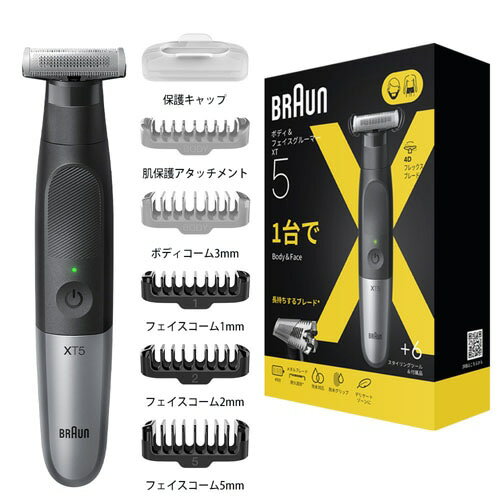 ・全身のムダ毛ケアをこれ一本で・最長6か月の耐久設計・デリケートエリアにも優しい肌を守る&密着剃りブラウンのボディグルーマーシリーズXT5は、スキンガード搭載で、肌を守りながら、刃が前後に動くので凹凸にフィットして密着剃りを実現します。速い&効率的4Dフレックスブレードは広いカッティングエリアを持ち、1秒間に450回の動きで、短時間で完璧なグルーミングが可能です。簡単&快適T字型で剃りやすいから難しい部分でもきれいに剃り上げることができます。長持ちするブレードフルメタルの刃は最大6ヶ月1持続し、各ストロークで輪郭に快適にフィットします。簡単お手入れ100%防水。XT5はコードレスで45分間の連続使用が可能です。こちらの商品は「ひと家族様3点限り」となります。同一お届け先、同一名義による4点以上のご注文、または当店が転売目的と判断した場合、ご注文を取消しさせていただく場合がございます。●最大駆動時間:45分●充電時間:10時間●急速充電:--●重さ:105g●寸法:152 mm x 35 mm x 30 mm●電圧:ニッケル水素電池●周波数:100-240V●電池の種類:50-60Hz●同梱物:ボディ&フェイスグルーマー XT5 フェイスコーム(1, 2, 5 mm) ボディ用コーム (0, 3mm) 保護キャップ スマートプラグ